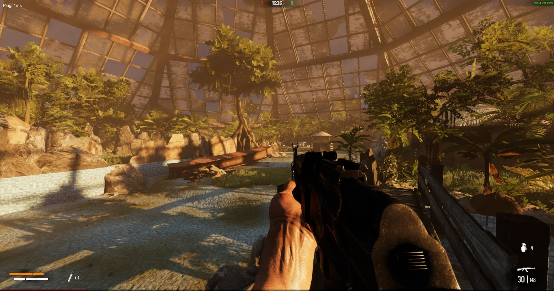 For the replayability of the game I looked at how to add/influence this from a map perspective. I have played plenty of FPS games in the past and often the maps became "stale" as these maps are played in the same weather. So you'd always play that one map in night time, or broad daylight for example. Now the big studios usually have quite a few maps at the launch of the game, and pump out more after that to keep it fresh by having a large rotation of maps. It takes me about a month to make 1 map, and was thinking on how I could get "more" out of said map for a little bit of extra effort. The solution to me was doing different "versions" of the map with various weather conditions. Playing a map in broad daylight is very different from a foggy midnight variant. I wrote down various ideas of what could work and what not. Snow for example doesn't work well as models would need to be updated, so I'll leave snow-covered maps for later. Some of the ideas that do work on a lot of maps are rain / thunder and fog. For Tropicana there's the following: - Sunset weather condition - Midnight fog - Midnight thunderstorm (slight epilepsy warning) For Factory: - Midday clear sky - Midnight fog (midnight fog makes the game go spooky real fast) - Rainy cloudy middayOther Improvements
