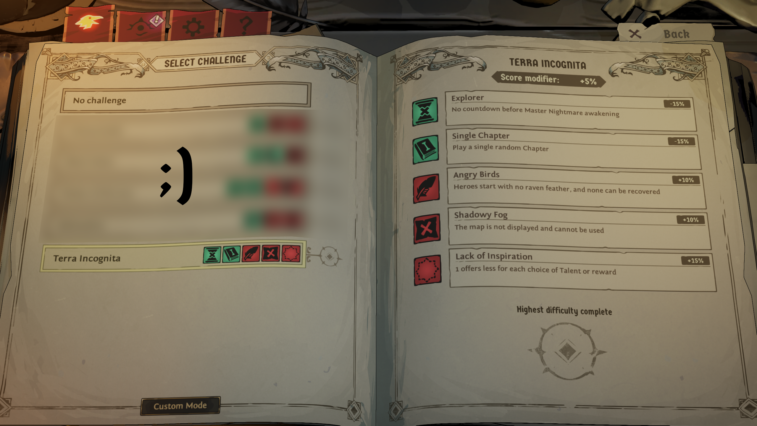 [b]Custom runs and Challenges[/b] are making their big debuts in the Fall of Avalon update! In addition to a whole new Chapter to explore, we thought: [i]why not even more replayability with a way to customize runs?[/i] With modifiers, players will be able to tailor their Ravenswatch experience the way they want it to be. [b]No more timer? Done. Play only during Nighttime? Done. All enemies are Corrupted? Done. No Mini-Map? Done.[/b] We could go on… But we’ll let you discover all that on April 22nd! You’ll be able to lower or increase the challenge with the Custom Modes. With those modifiers, we created pre-made [b]Challenges[/b] that you can select both in solo or in co-op. Here’s an example of a Challenge we curated for you ???? :Terra Incognita