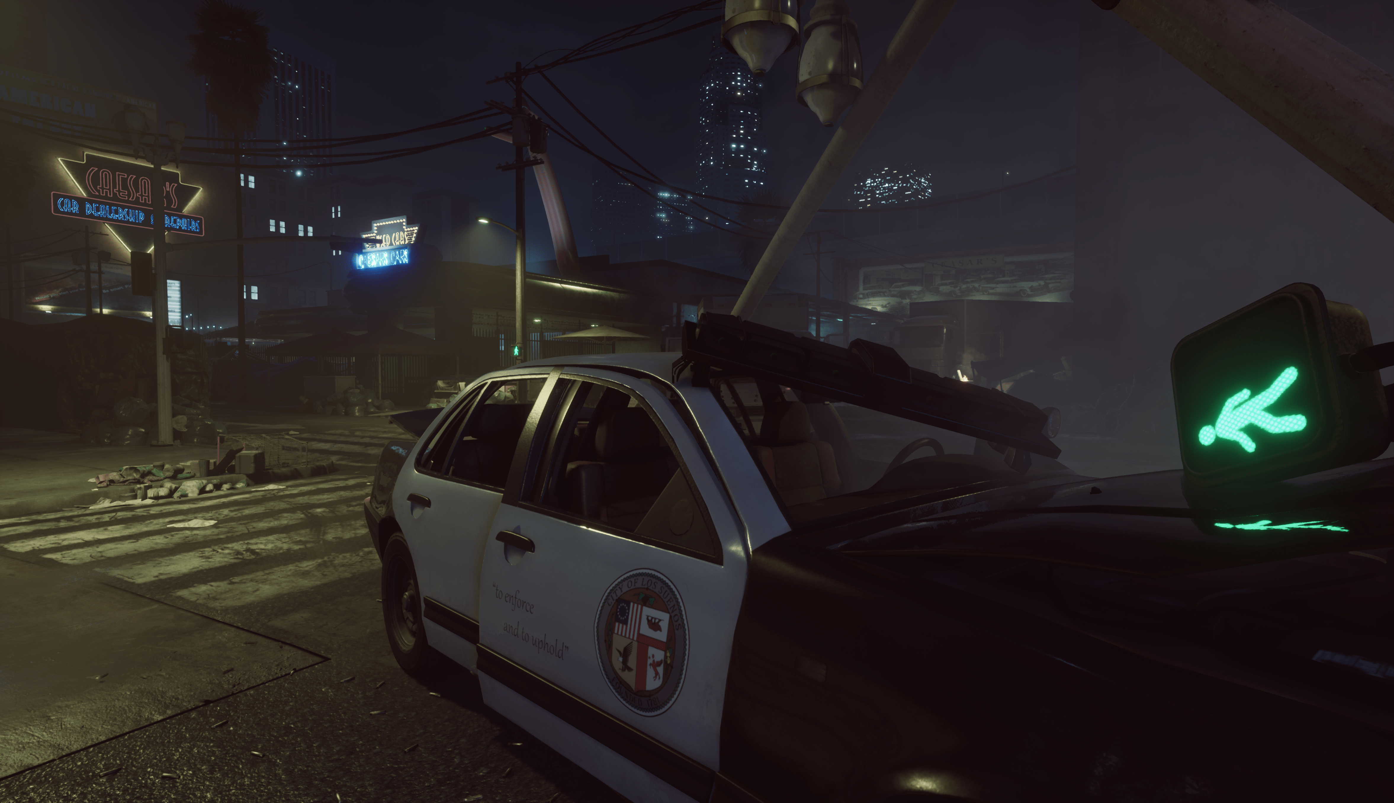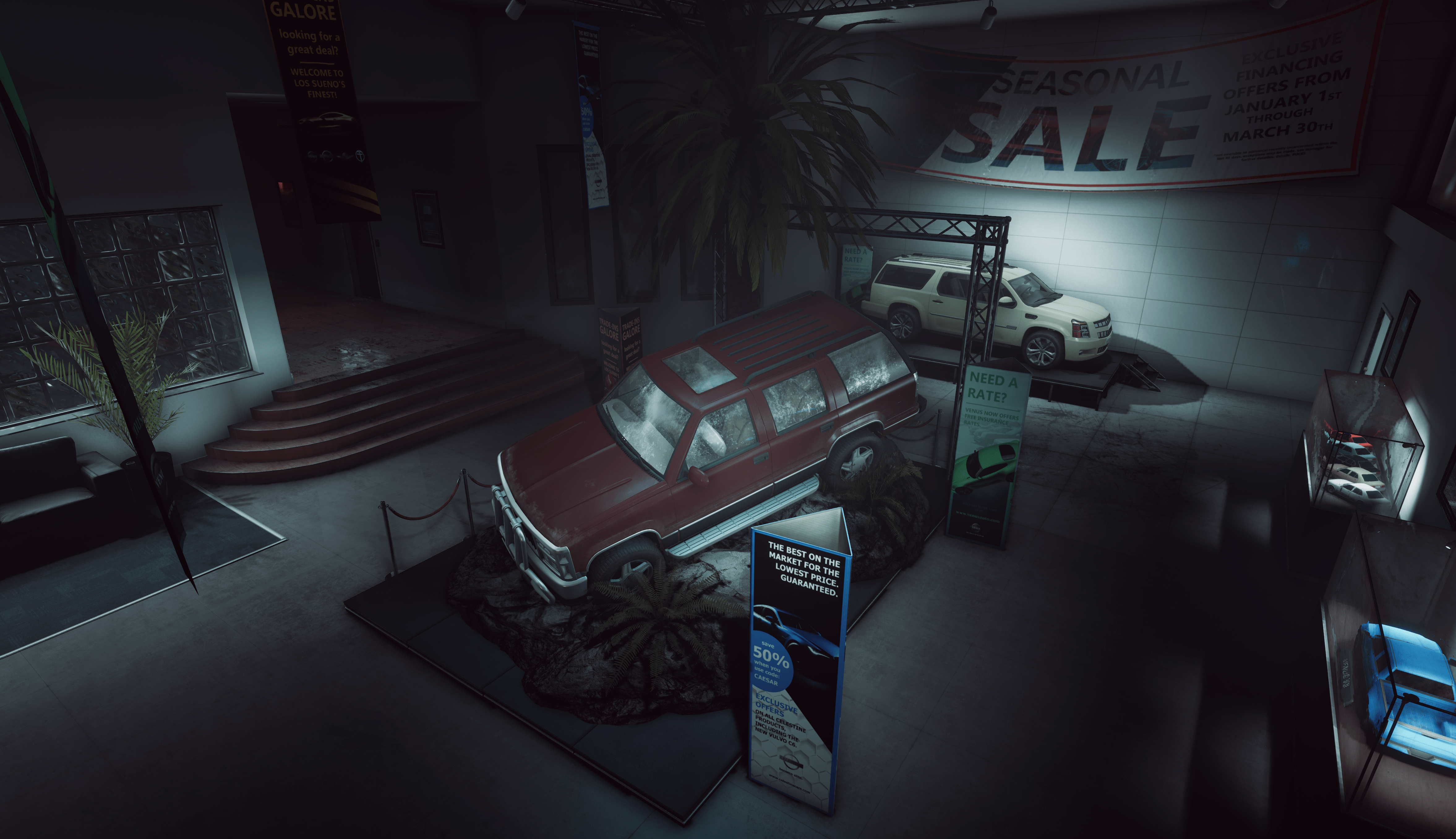 [i]“Dealer, on top of receiving a narrative, design, and art update, throws players into a tense, dark environment with a high number of suspects and civilians. Suspects blend in here, with the intent to coerce the SWAT team into gaining information before entering rooms and discerning who is a threat and who is not. There is also an undercover agent on this level, who must be apprehended but will appear as a potential threat if not listened to.” [/i] – Gruntr [u][i](Image below: A view of the Caesar’s Car Dealership’s parking lot on the left and front entrance on the right) [/i][/u]