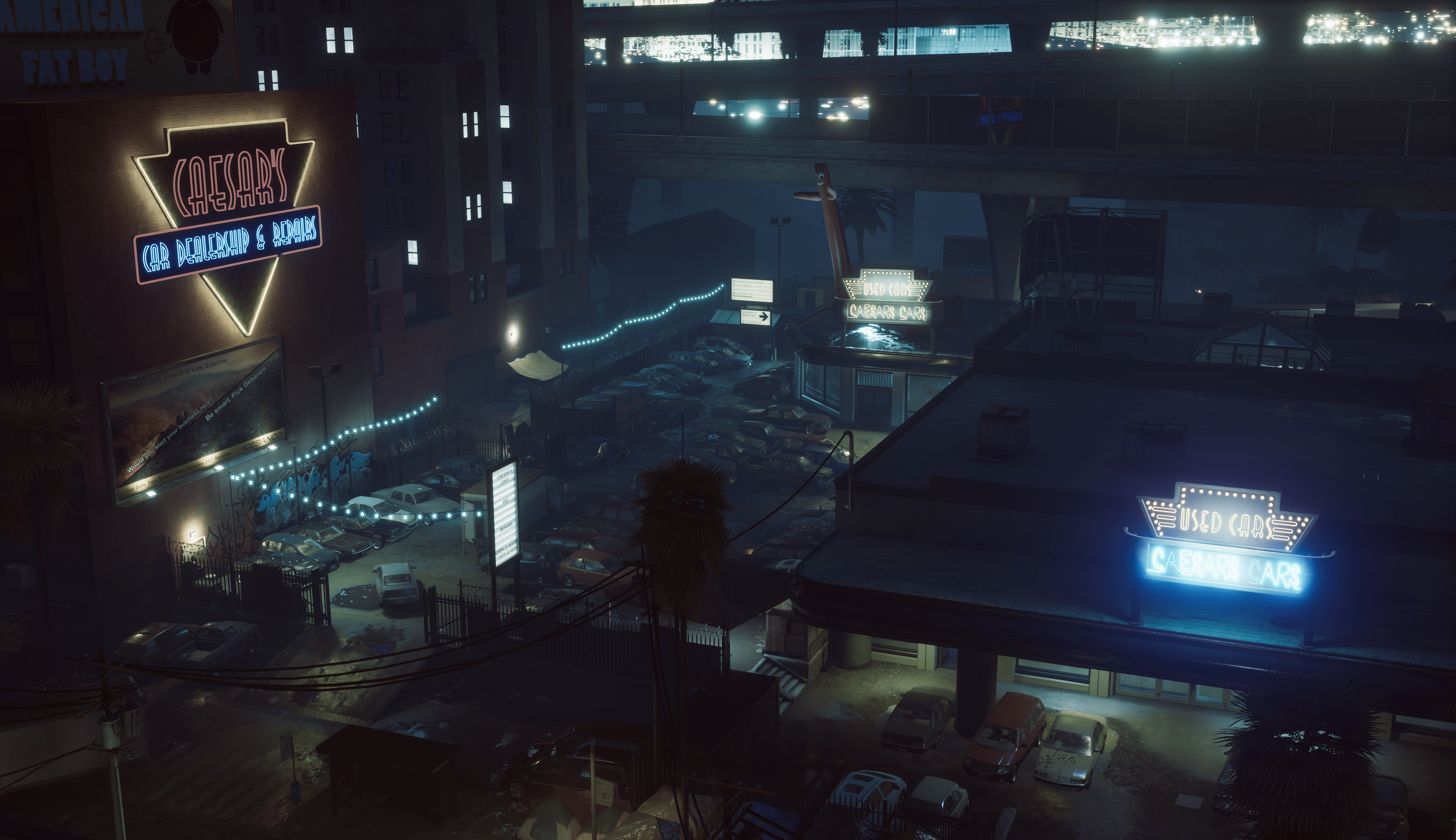 The colorful neon signs of Caesar’s Car Dealership inscribing the night sky lure you towards destructively deadly engagements among its slickly lit parked cars. Where in the previous version of the map the parking lot served as a brief entryway to the building itself, this version gives you the option to enter the lot or take the street to two other entryways. In total, you can currently approach from the parking lot, front entrance, and mechanic garage.