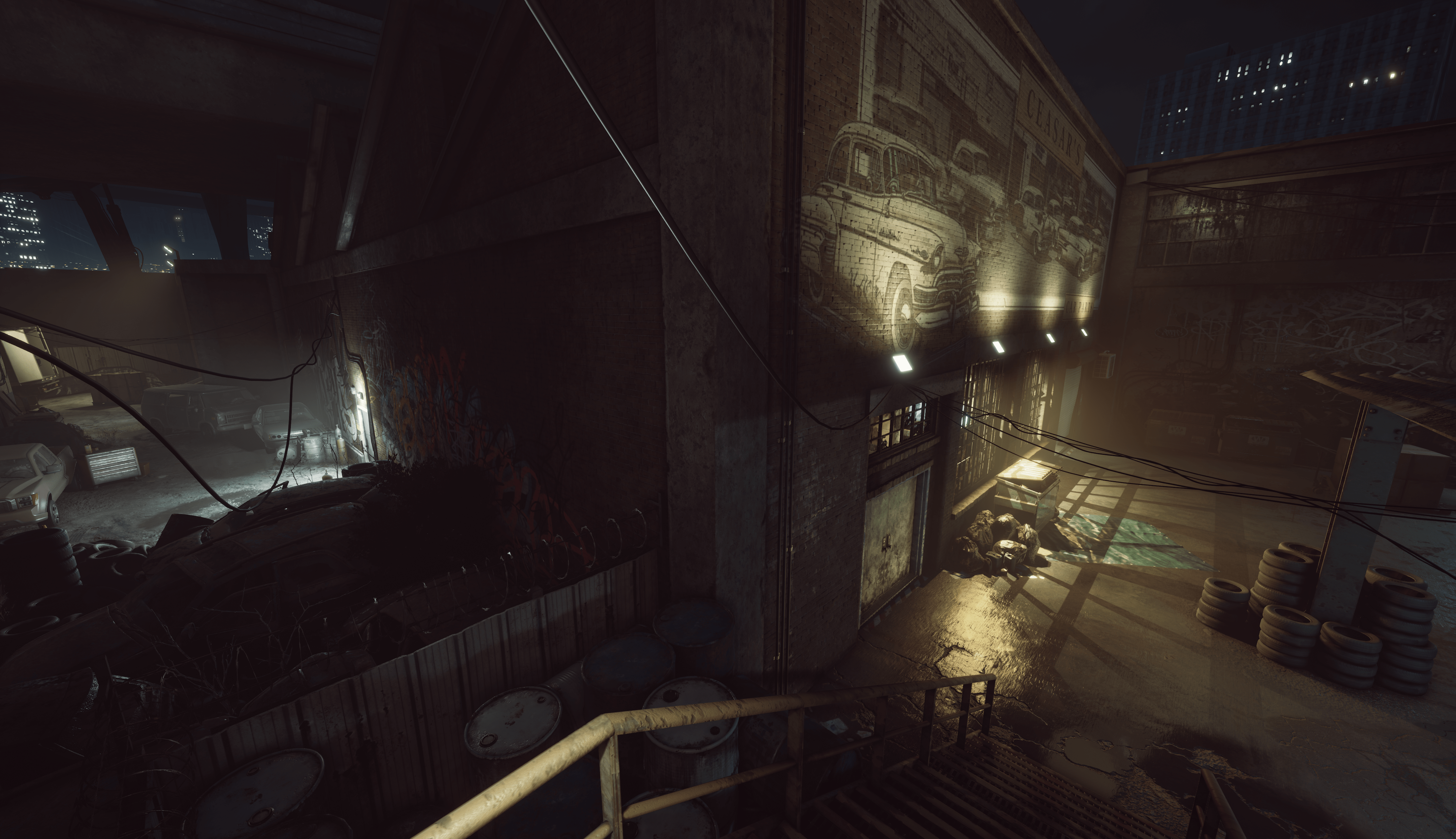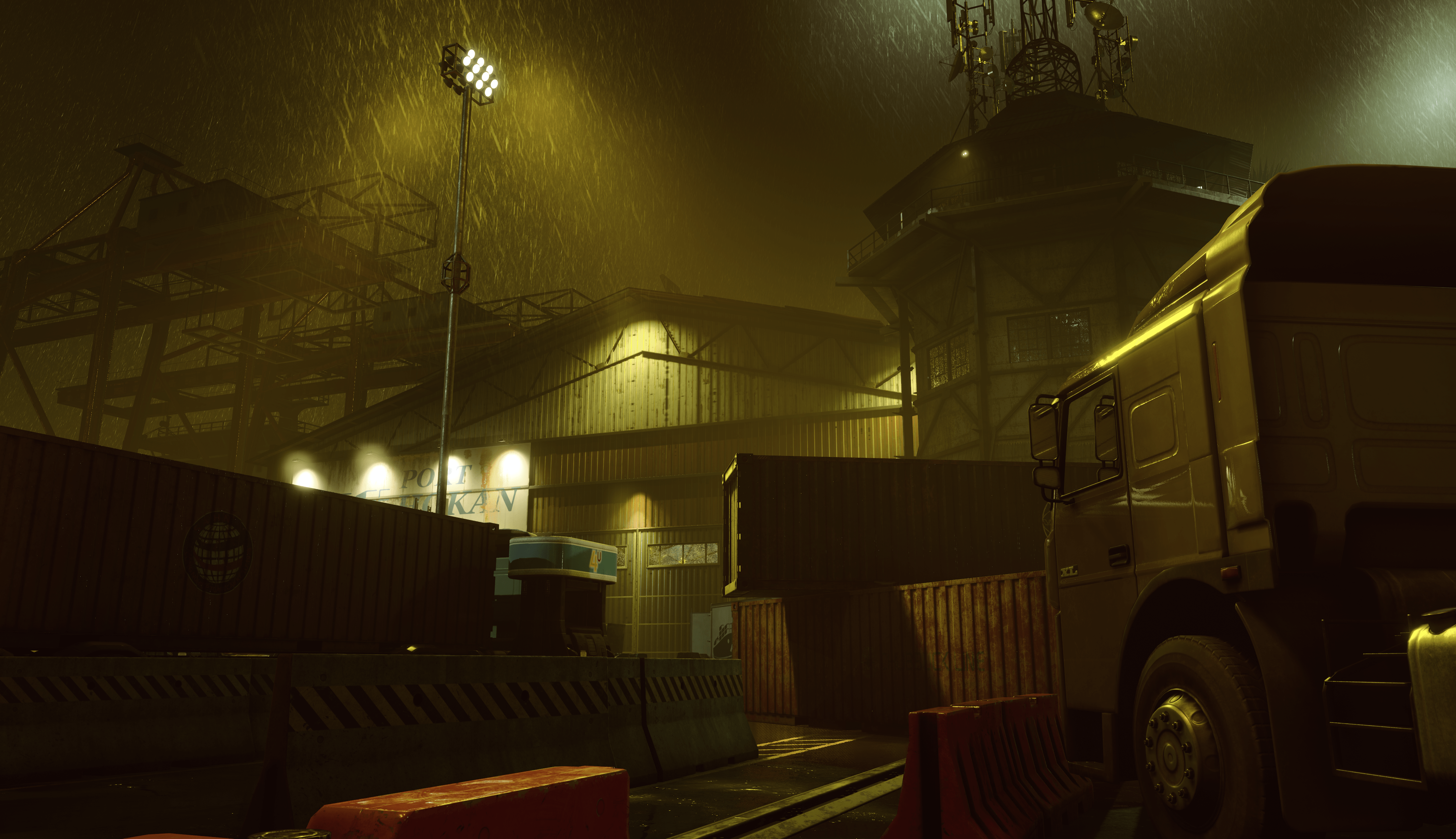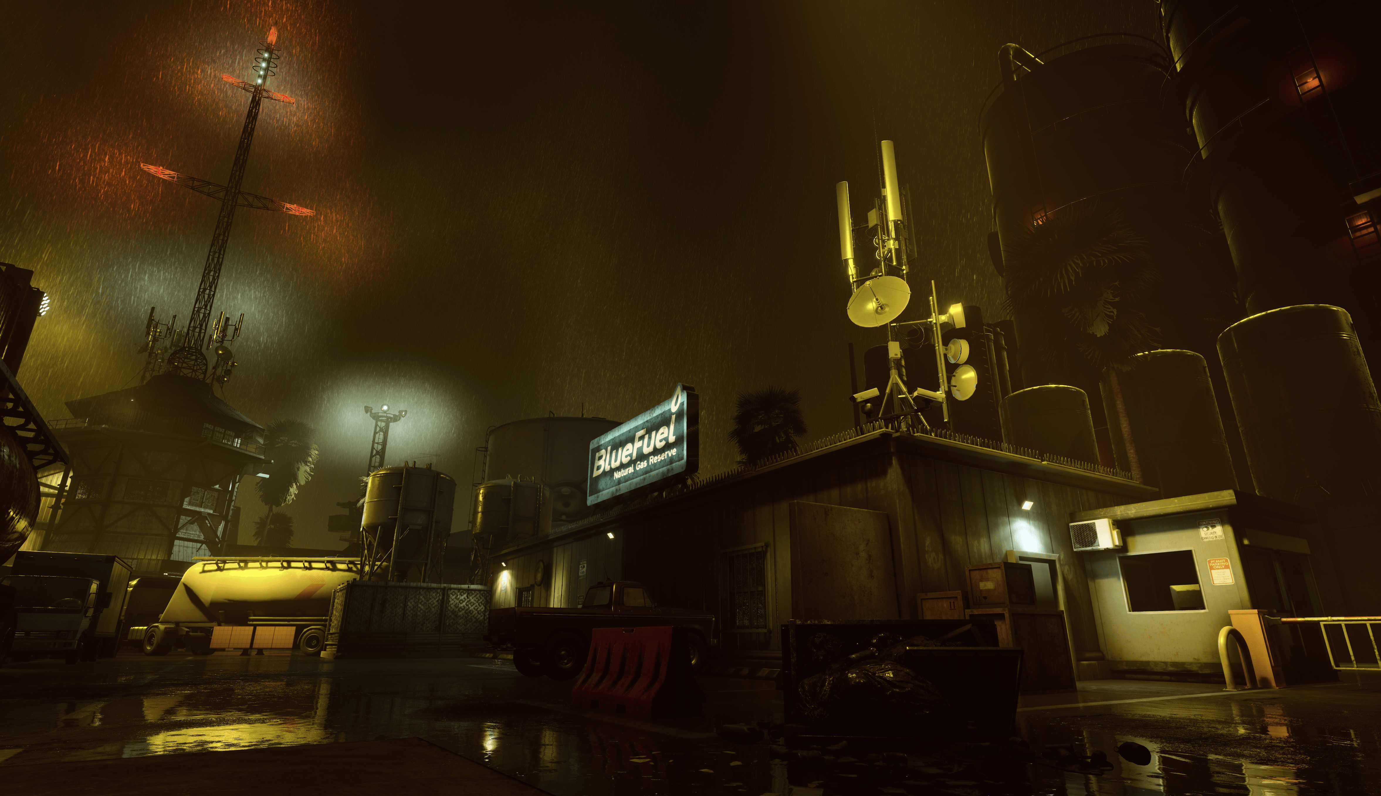 [i]“...whilst there is alot of industrial lights illuminating the scene— with the nature of it being at night and in the rain, the light itself is very harsh and does not scatter around as much as daylight does, for instance. [Industrial lights] lead to darker shadows as a result, meaning night vision and flashlights might end up being your best friend going into these areas [that aren’t directly lit]." [/i]