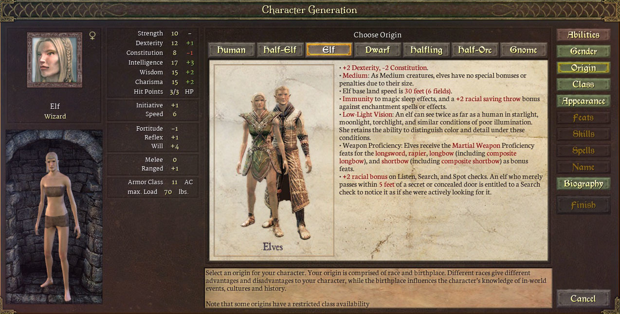 Rather than just picking a race and be done with it, [i]Realms Beyond[/i] lets you choose your character’s origin: which region of the world does your character hail from? It is more than just a cosmetic choice, as your character’s origin will influence the knowledge of local customs, politics and events the character has, as well as the reaction some NPCs will have towards that character.