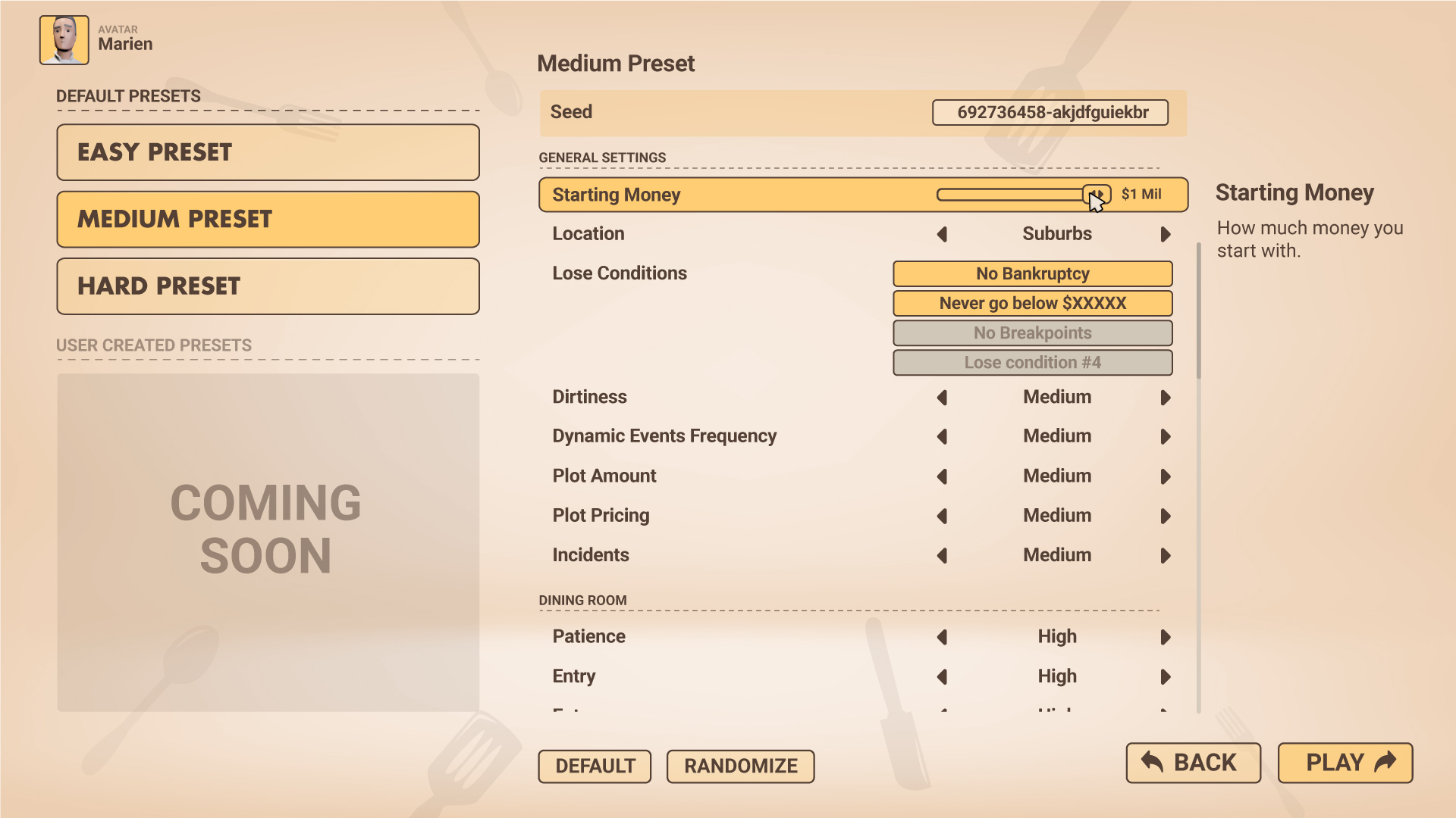 [b]Difficulty presets (Easy, medium, hard, custom) -[/b] To make it easier to jump straight into a new game, or load your custom settings.