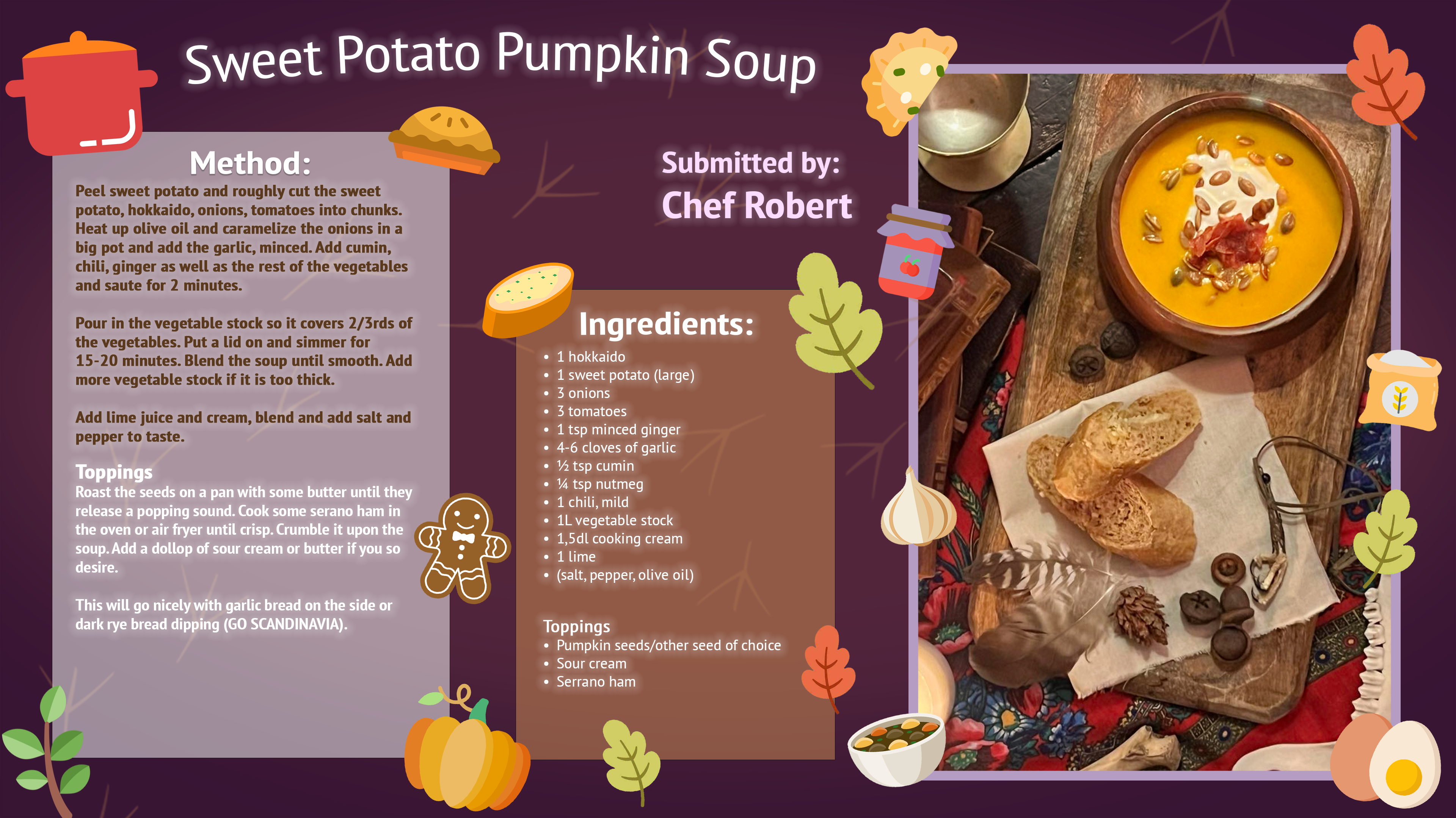 Over on our Discord, we held a cooking competition where we had loads of hearty and wholesome recipe submissions. We decided to gather all these culinary delights together and create [b]The REKA Recipe Book[/b]! From mini cinnamon roll cheesecakes to warming stews with winter roots, there's something for every chef. The winner of the competition was Robert with their [b]Sweet Potato Pumpkin Soup[/b]!