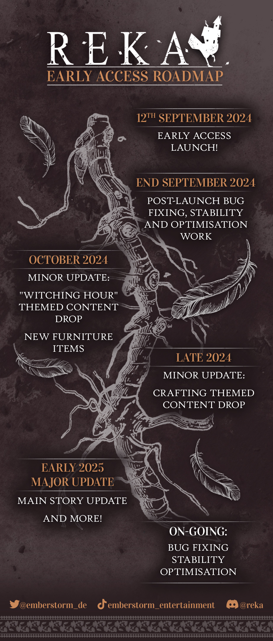Here's what we’ve got planned for the future of REKA. Things might change slightly as we’ll be listening to your feedback very closely, but this is what we’re working on for the foreseeable future. [b]Your thoughts on our game are super important to us[/b], so please do share how you get on with REKA. The best way to have your say is by the [url=https://discord.gg/wcHbw8C8Hu][b]Feedback channel in our Discord[/b][/url], however we are active on all social platforms and we’re always checking our Steam forums too.