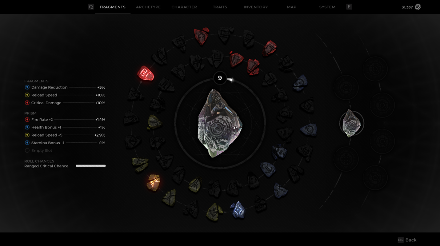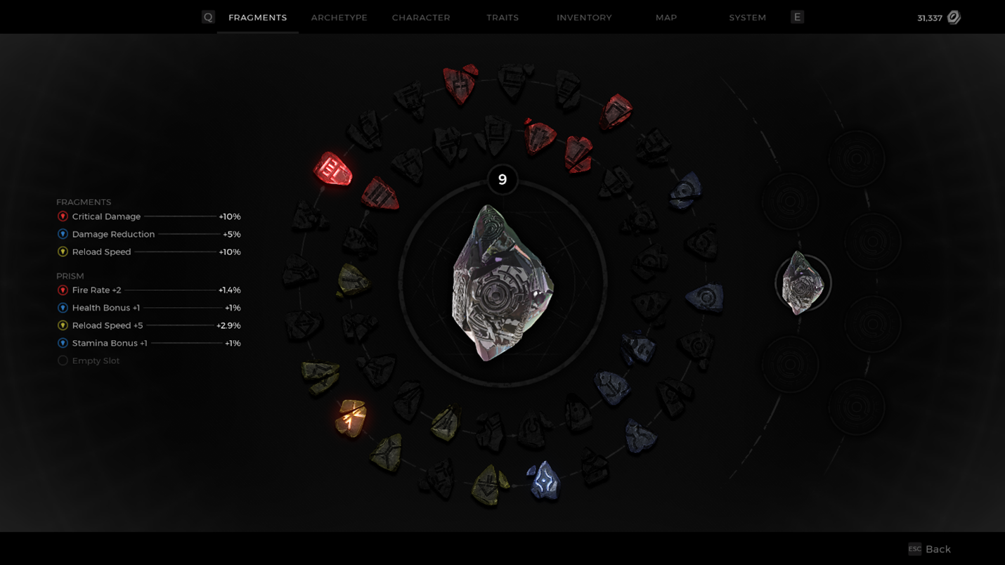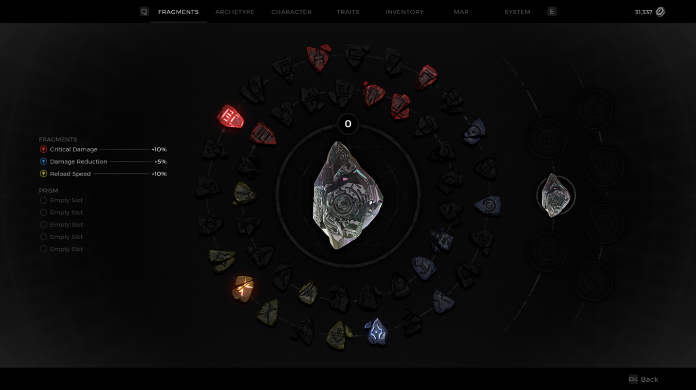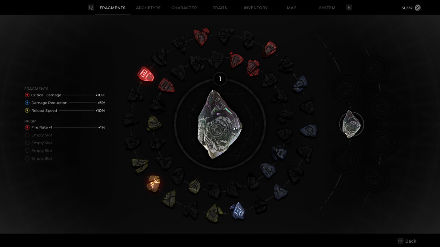 In the example below, the Prism was leveled up a few more times by grinding out EXP – kills, quests, etc - and a few more choices have been selected. When leveling up a Prism, your choices matter, because you want to make a cohesive creation. Remember that the Fragment Slots above the Prism can be changed, so depending on what you put into your Prism, you may end up mixing and matching, or even double stacking when given the choice to add a new stat!