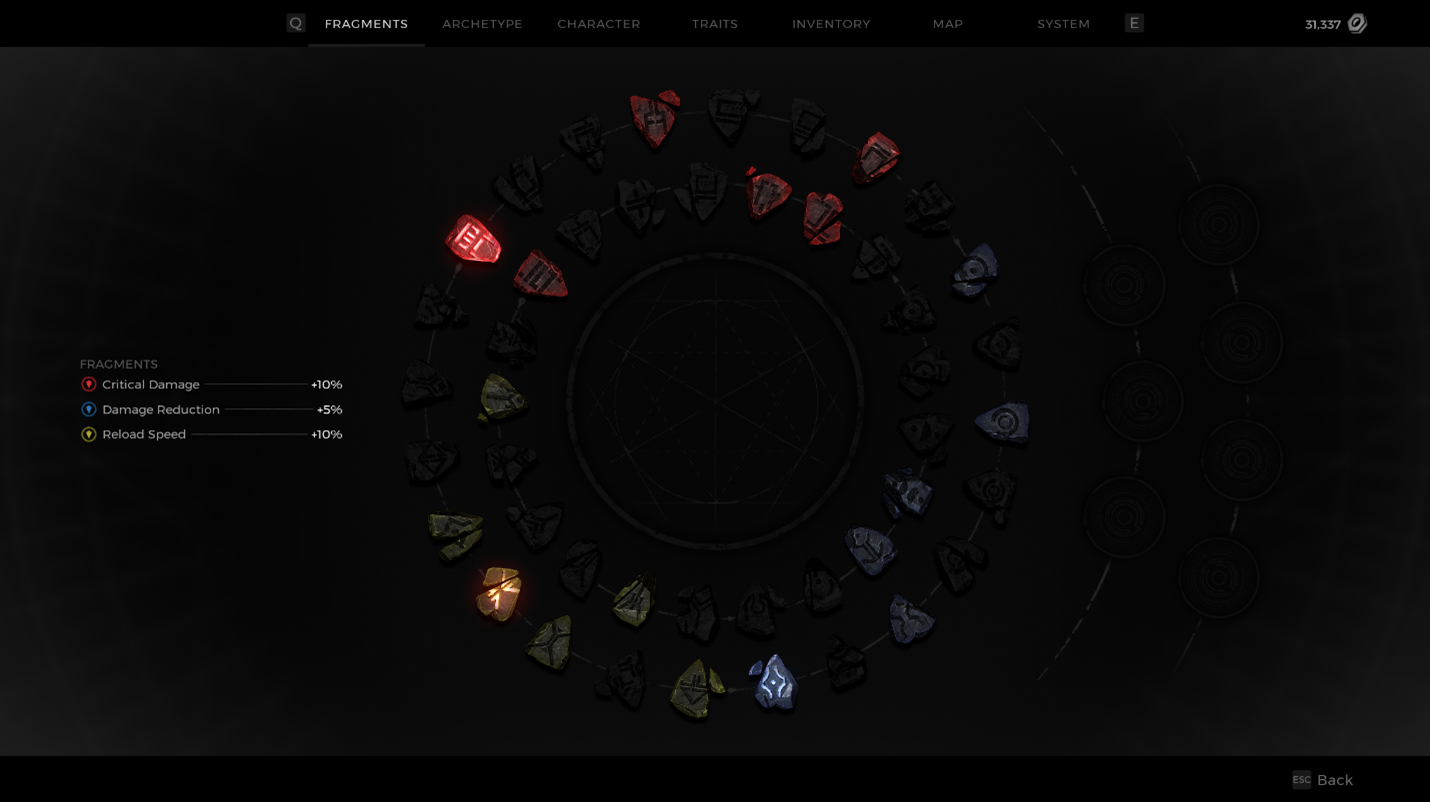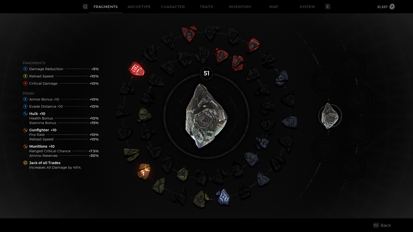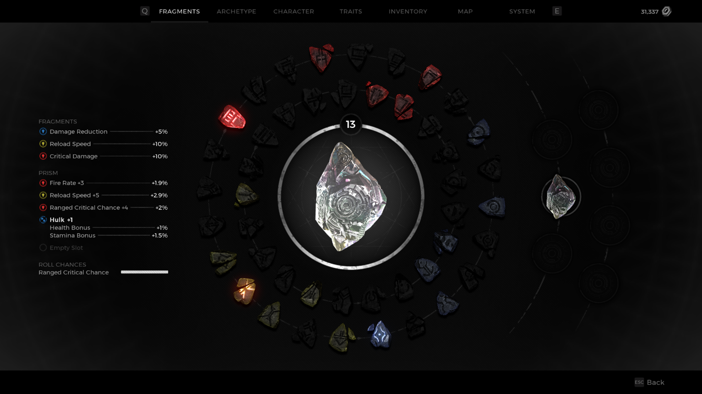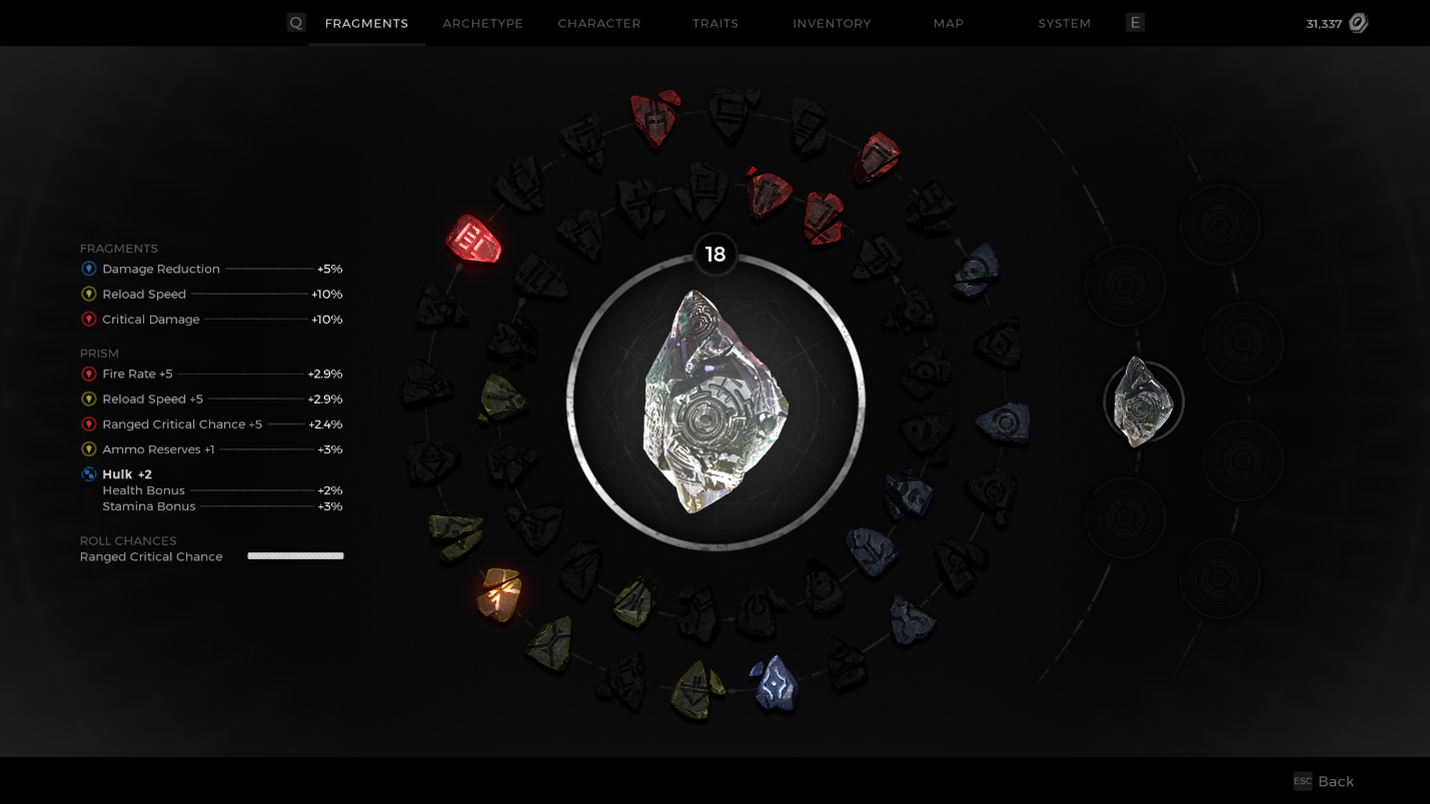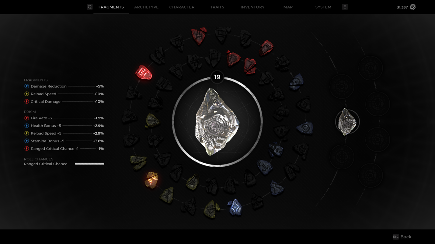 In the example below, the Prism was leveled up a few more times by grinding out EXP – kills, quests, etc - and a few more choices have been selected. When leveling up a Prism, your choices matter, because you want to make a cohesive creation. Remember that the Fragment Slots above the Prism can be changed, so depending on what you put into your Prism, you may end up mixing and matching, or even double stacking when given the choice to add a new stat!