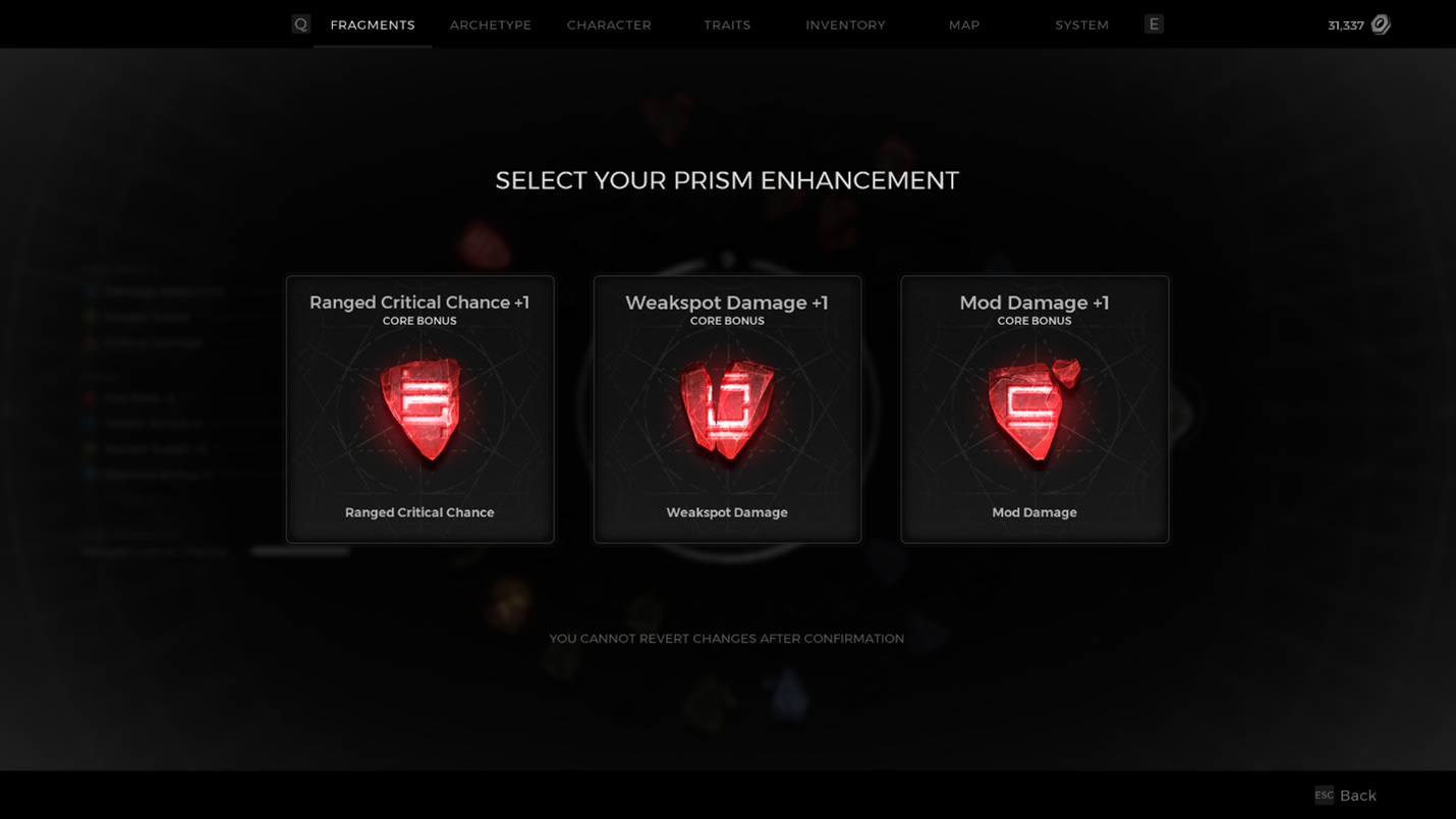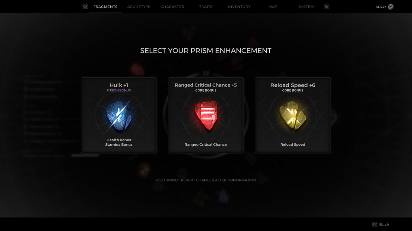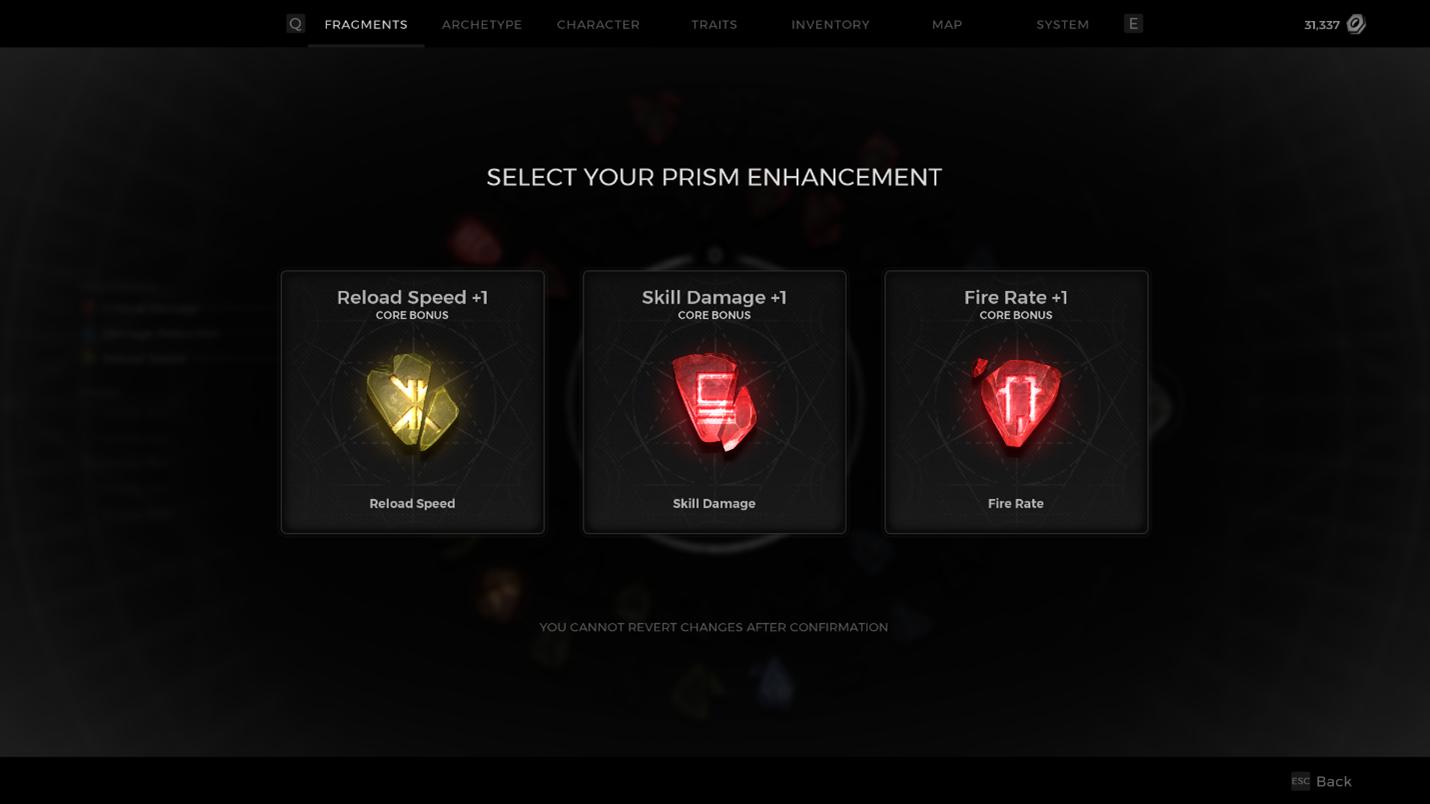 The player makes their choice, and they now have 1 of their 5 Prism slots filled with a Fragment buff. It’s important to note that until all slots are filled, each choice will be random from the entire group of 45 total options.