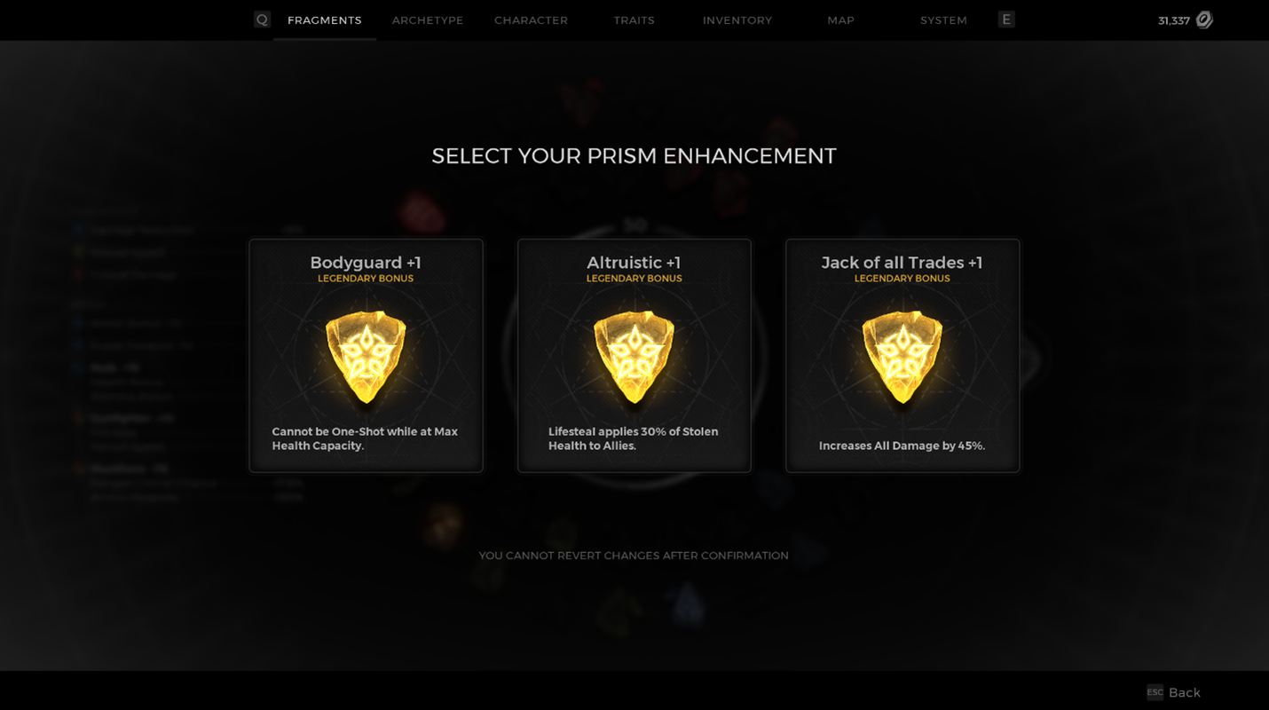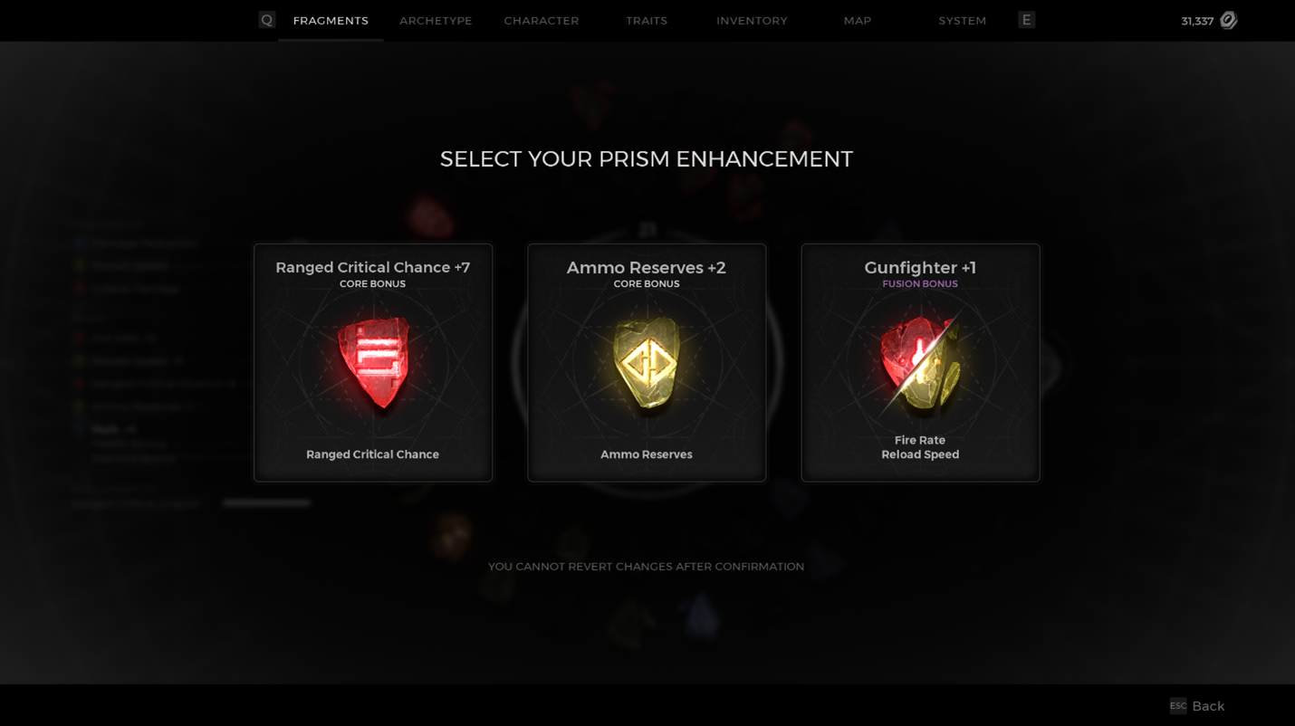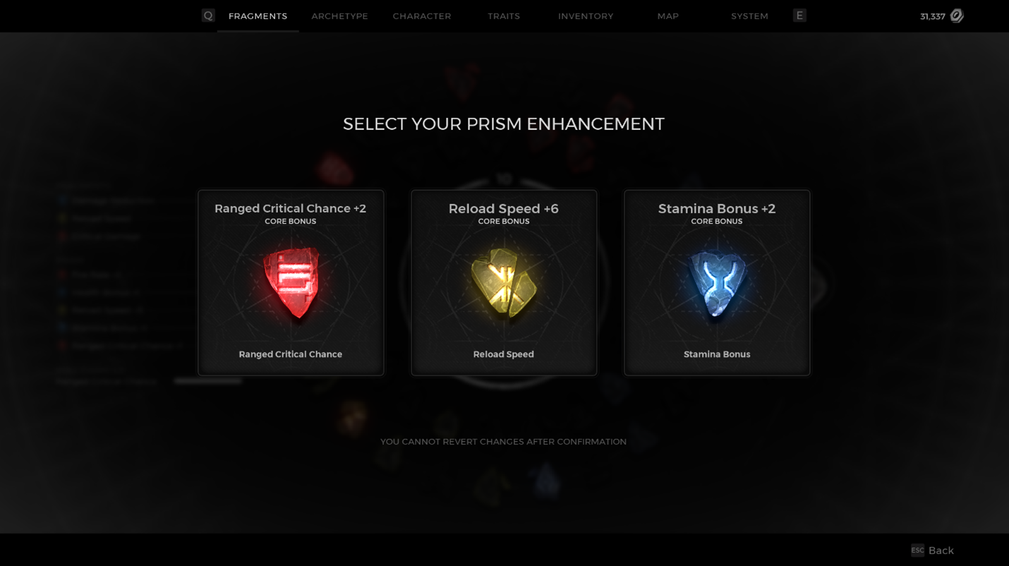 The player makes their choice, and they now have 1 of their 5 Prism slots filled with a Fragment buff. It’s important to note that until all slots are filled, each choice will be random from the entire group of 45 total options.