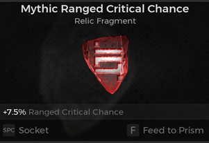 Feeding a Fragment to a Prism will destroy the Fragment, and depending on the quality of the Fragment fed, skew the roll chances of that stat. In the image below, we sacrificed a Mythic Ranged Critical Chance Fragment to obtain the maximum roll chance buff. It isn’t guaranteed, but it’s more likely to appear over time, which is why having more slots open is a good idea when sacrificing a Fragment.