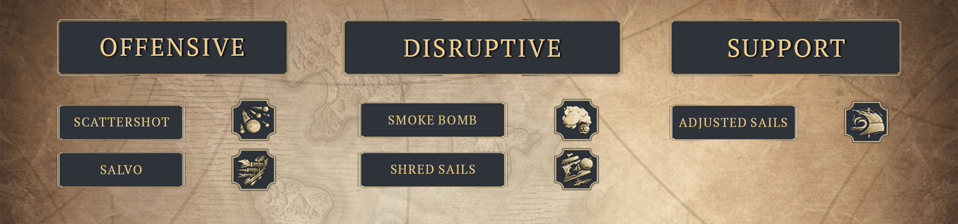 - [b]Skill description[/b]: Attack an enemy ship within range and damage their sails to slow them down for a limited time.