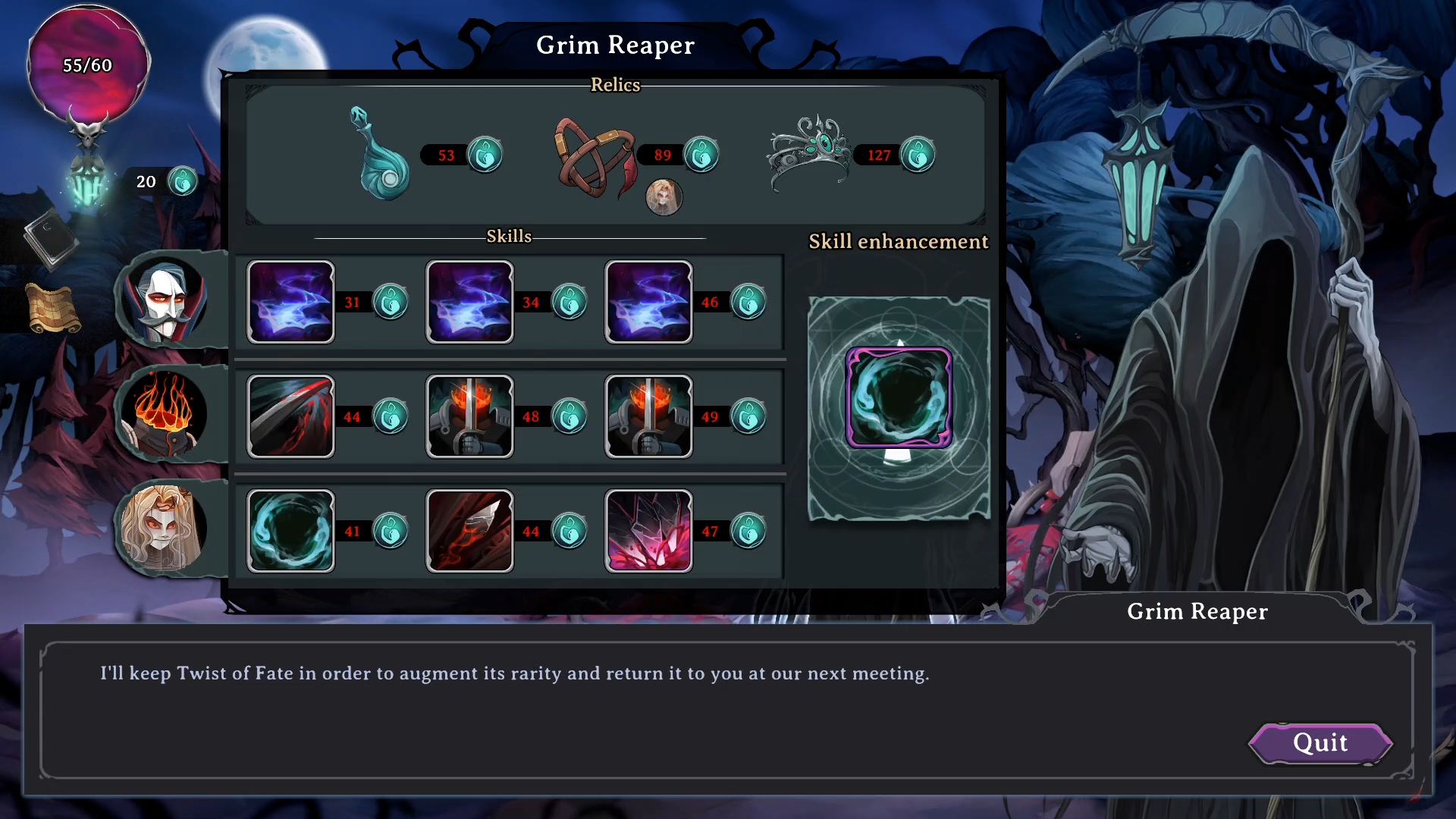 - [b]Regularly leave a skill with the Grim Reaper[/b]: you can even cheat on the world map to quickly return and regain the upgraded skill.