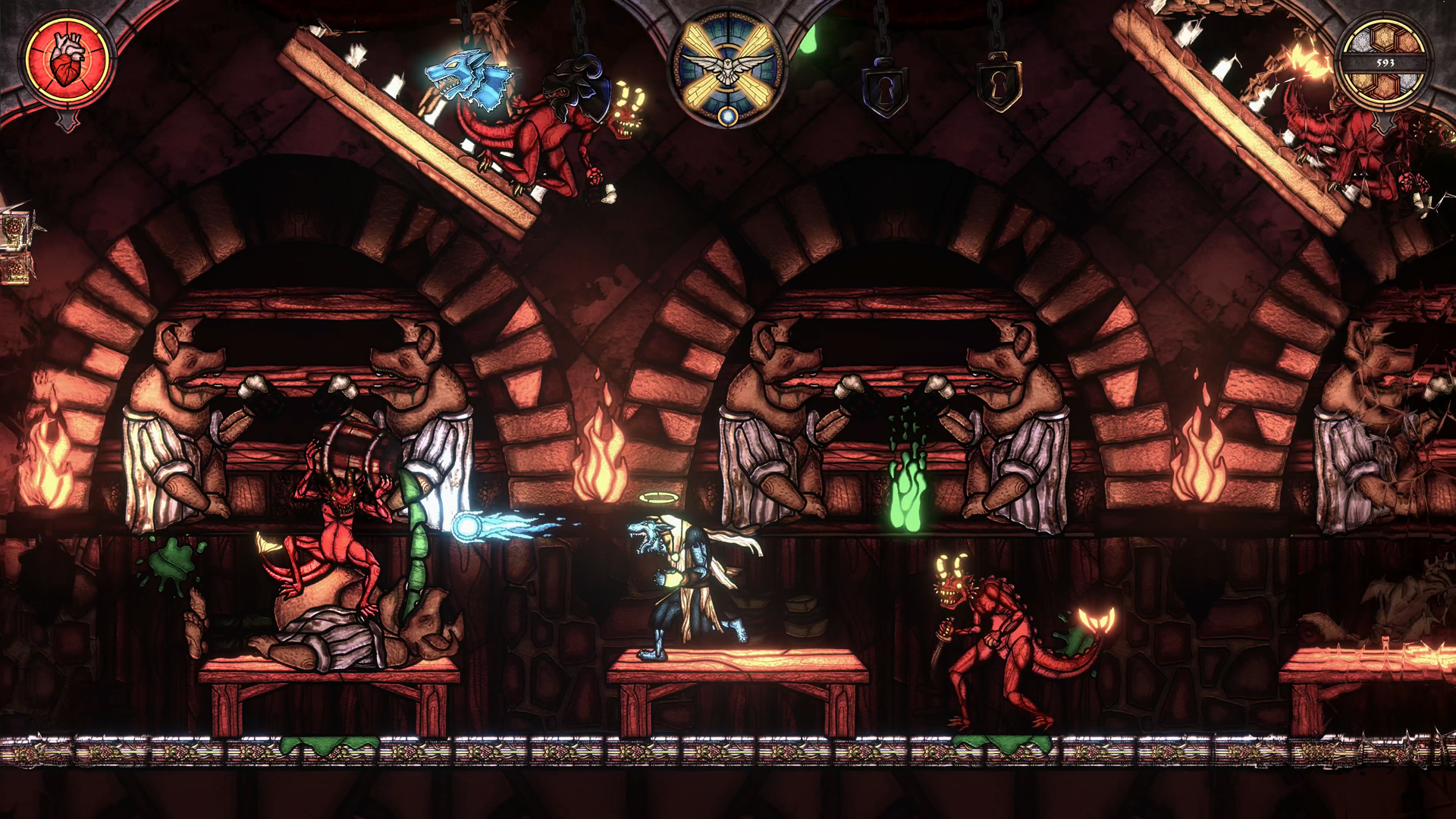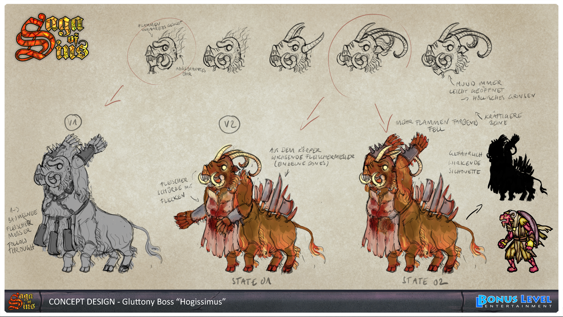 A mad, giant hog with dozens of knives in his back tossing burning barrels at you? Please say “Hail fellow, well met.” to our very first boss in Saga of Sins! The Hogissimus first attacks from behind a glass wall, which he then shatters with his devastating stomp attack, perfectly fitting to our stained glass art style. But he has even more dirty tricks up his sleeve… Will you be able to beat the Hogissimus and finally free the sinners of Gluttony?