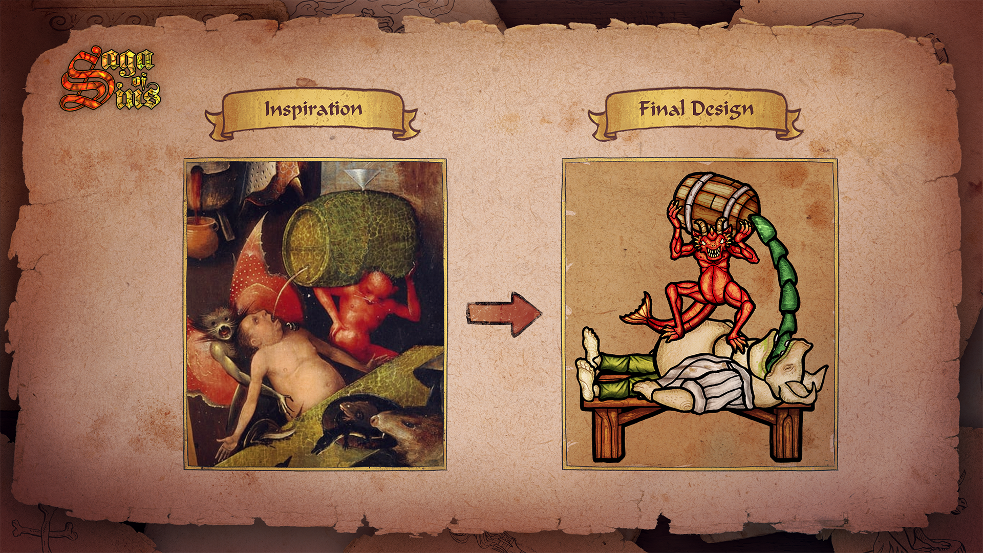 [i]Gluttony, Gula in old Latin, represents an excessive craving for food, drink or wealth. It is the overconsumption of anything to the point of waste. Temperance cures Gluttony.[/i] As you can see above, Gluttony manifested itself in the minds of the according sinners as a medieval tavern gone wild! Humans turned into feasting pigs, little devils are swinging on chandeliers dropping toxic liquid and the innkeepers are throwing around barrels of beverages. The idea of a red devil tormenting a pig by pouring acid in its mouth is actually inspired by the amazing triptych “Last Judgment” by Hieronymus Bosch, that was created around 1485.