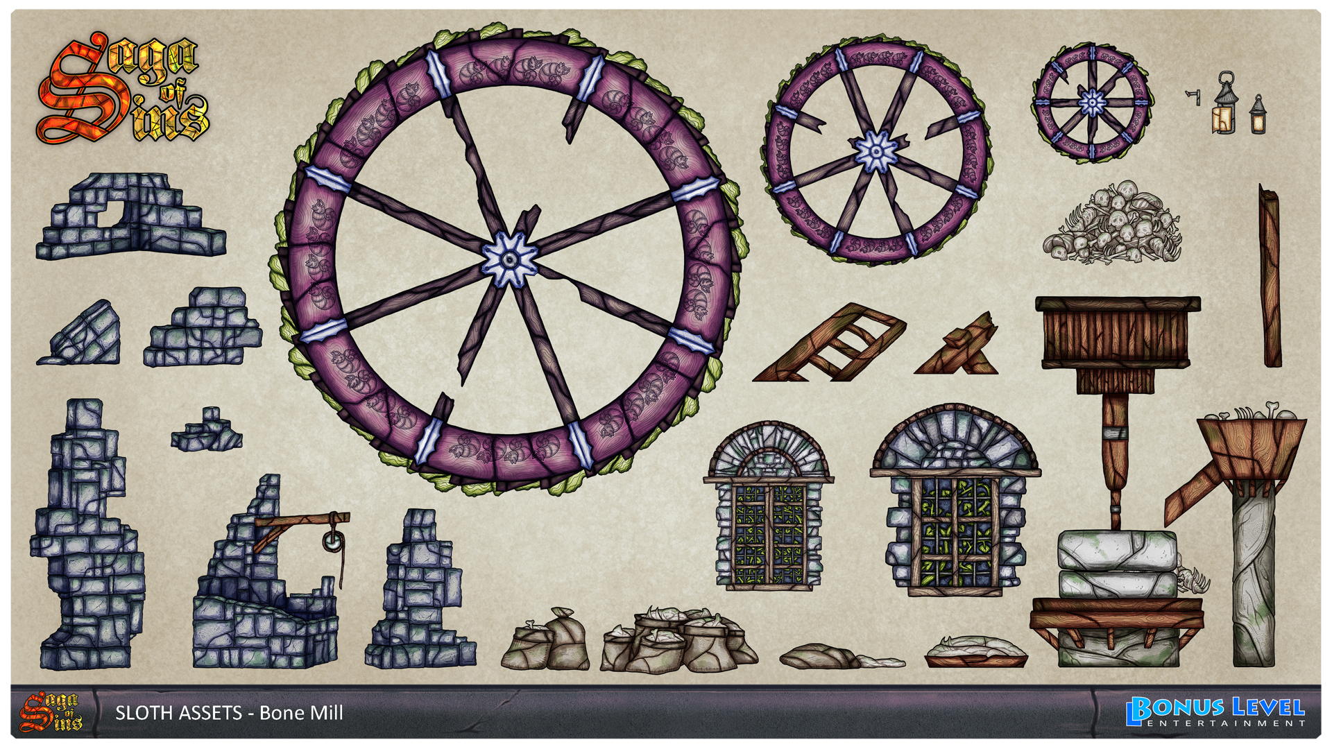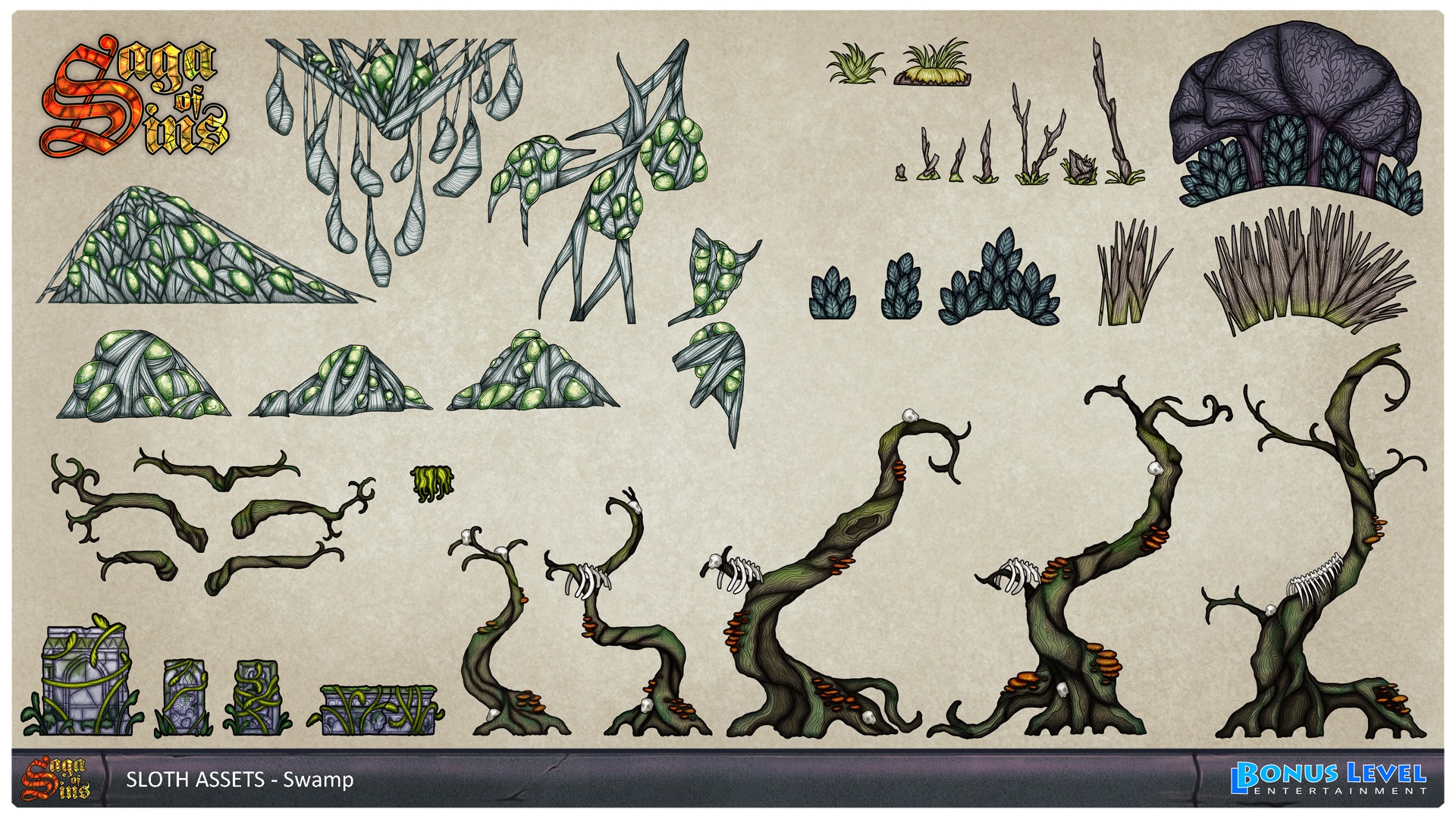 The setting for the two Sloth levels and the Sloth boss is muddy swamps, swamps filled with gravestones, bone crushing mills and a forest in the background with treetops resembling the shape of wolves.