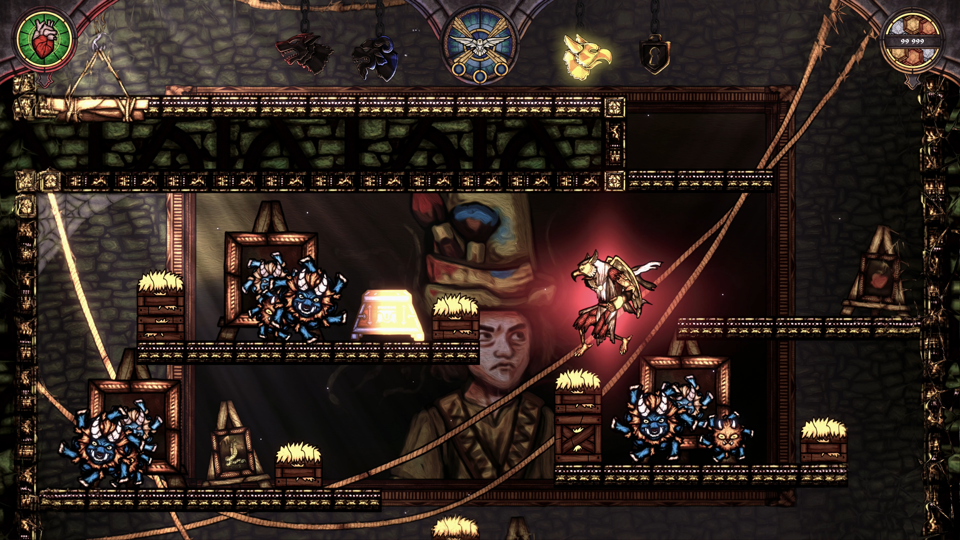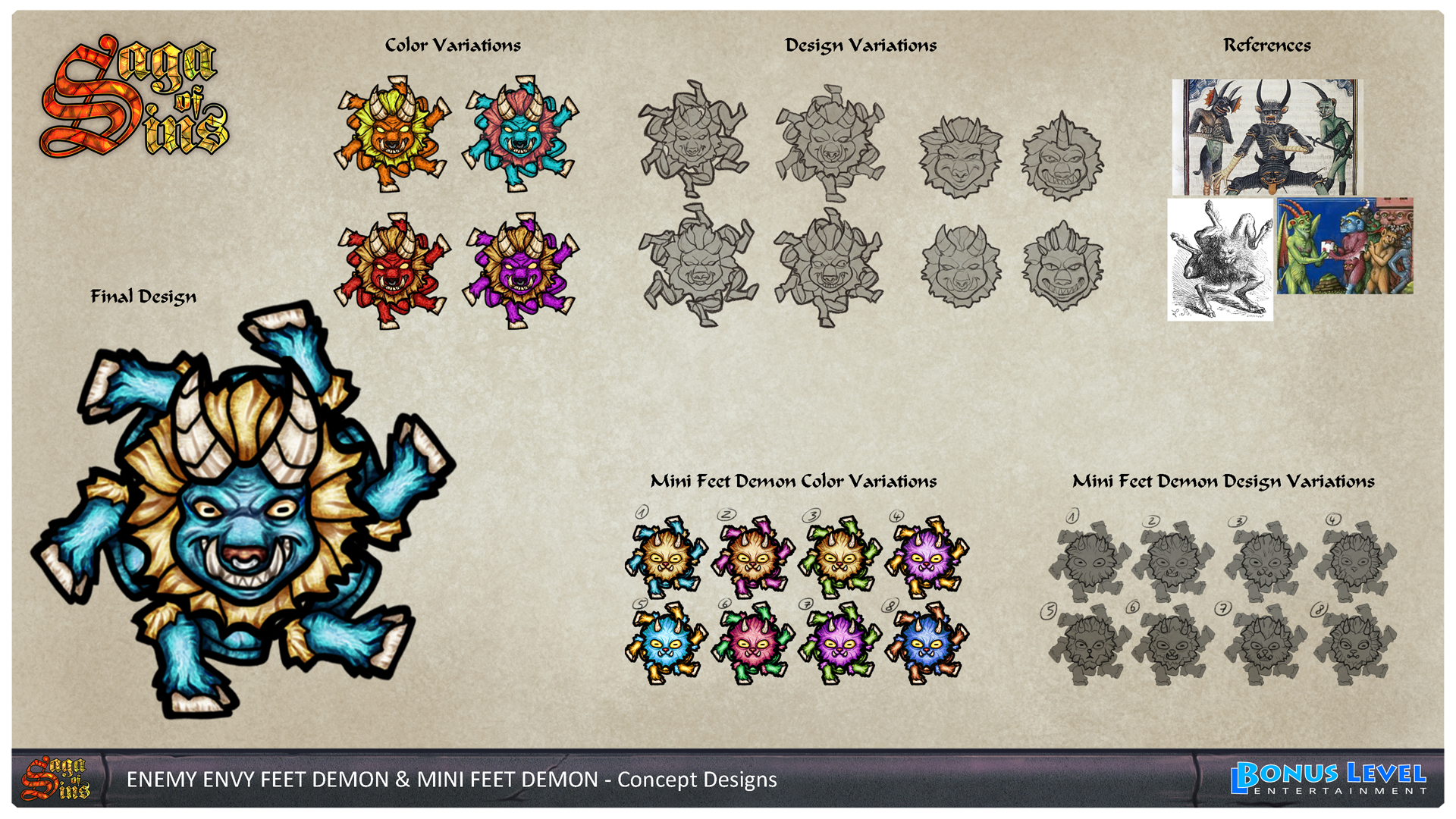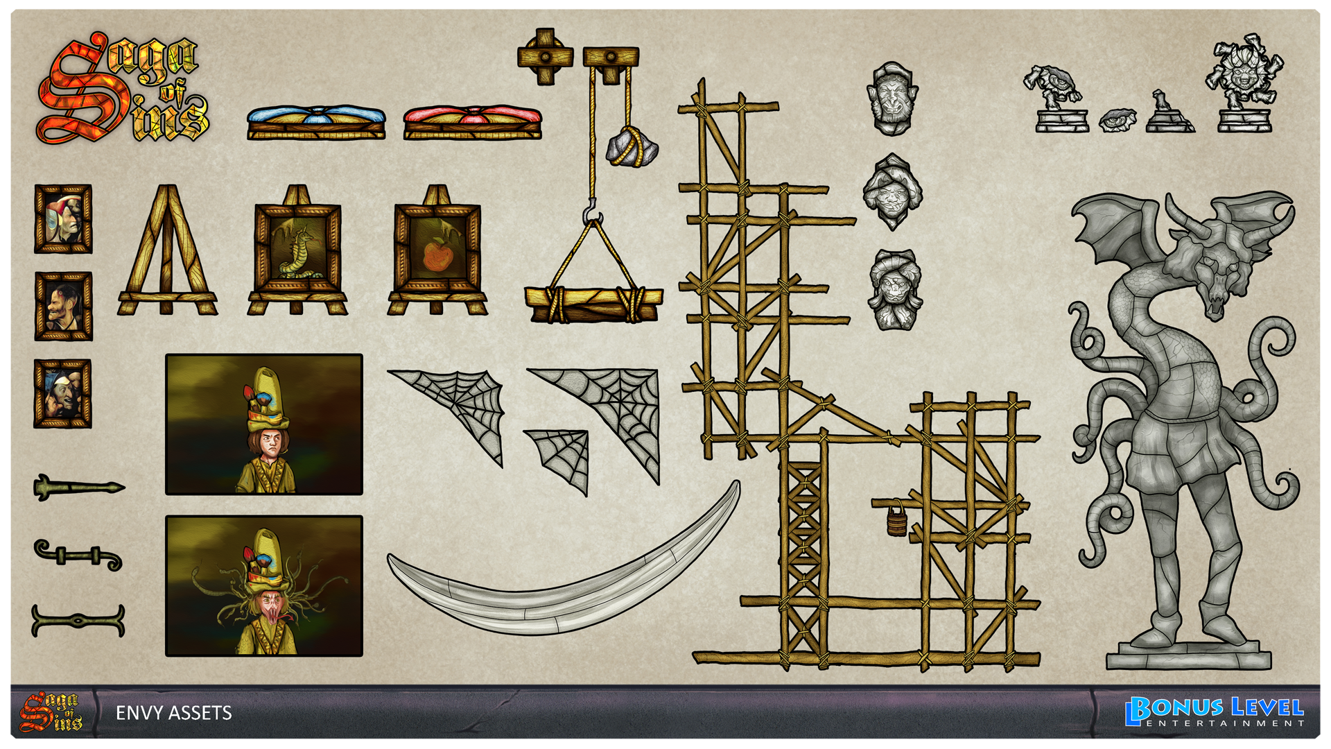 In Sinwell some of the villagers are amongst the artist guild. Painters and sculptors are all part of the same community, with the skilled but jealous Hieronymus being their leader. Envy has spread across them and so their minds are a mix between an artist’s studio and a tower - to manifest “striving for more” and thus climbing up or down “the ladder”. In the first Envy level, the according villager can even be seen in the oil painting that is hanging in the back of the level’s wall. The Feet Demon is also first introduced in this level. Sometimes its little descendants are following him, perfect for Power Dash combos and extra coins…