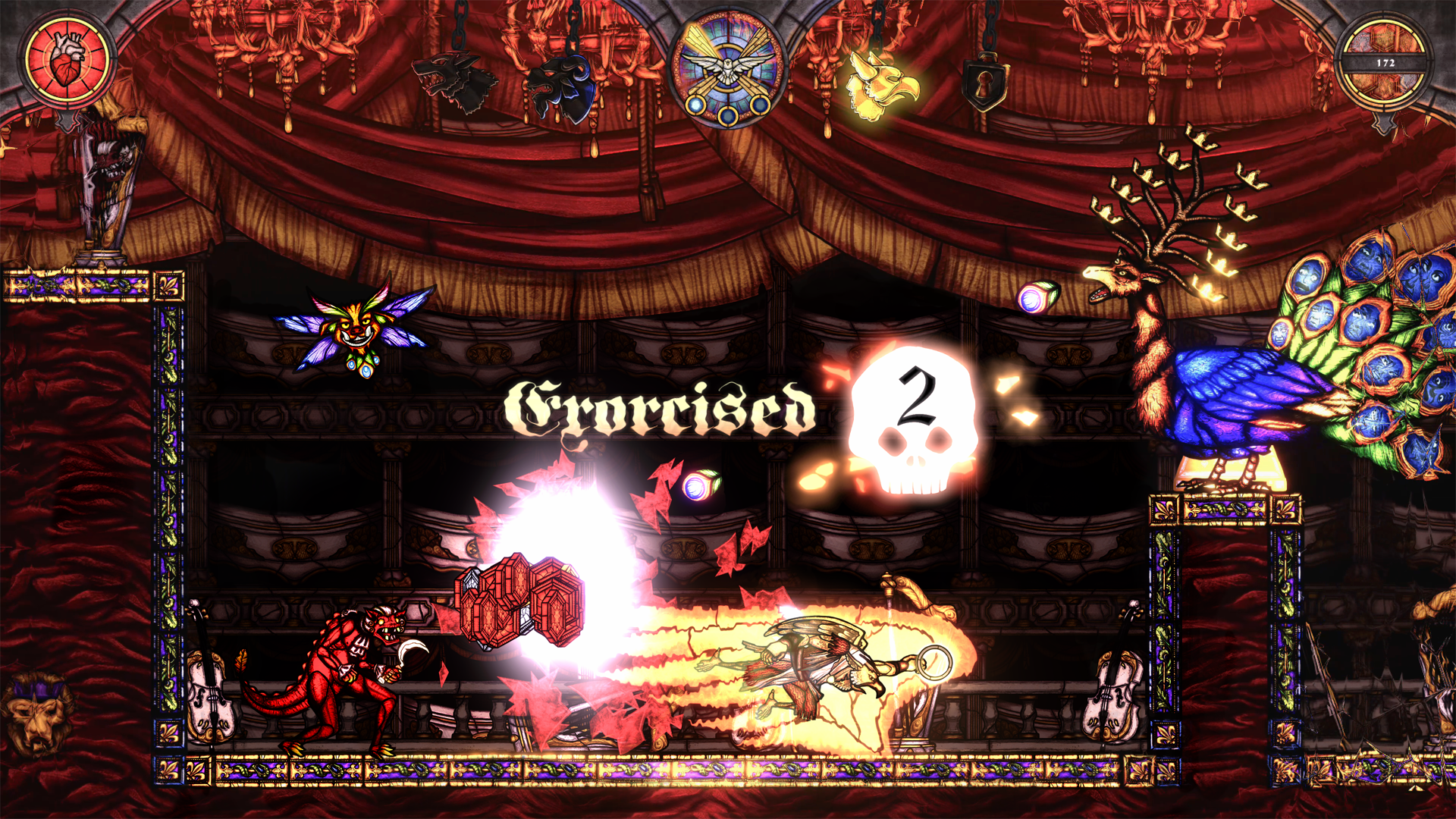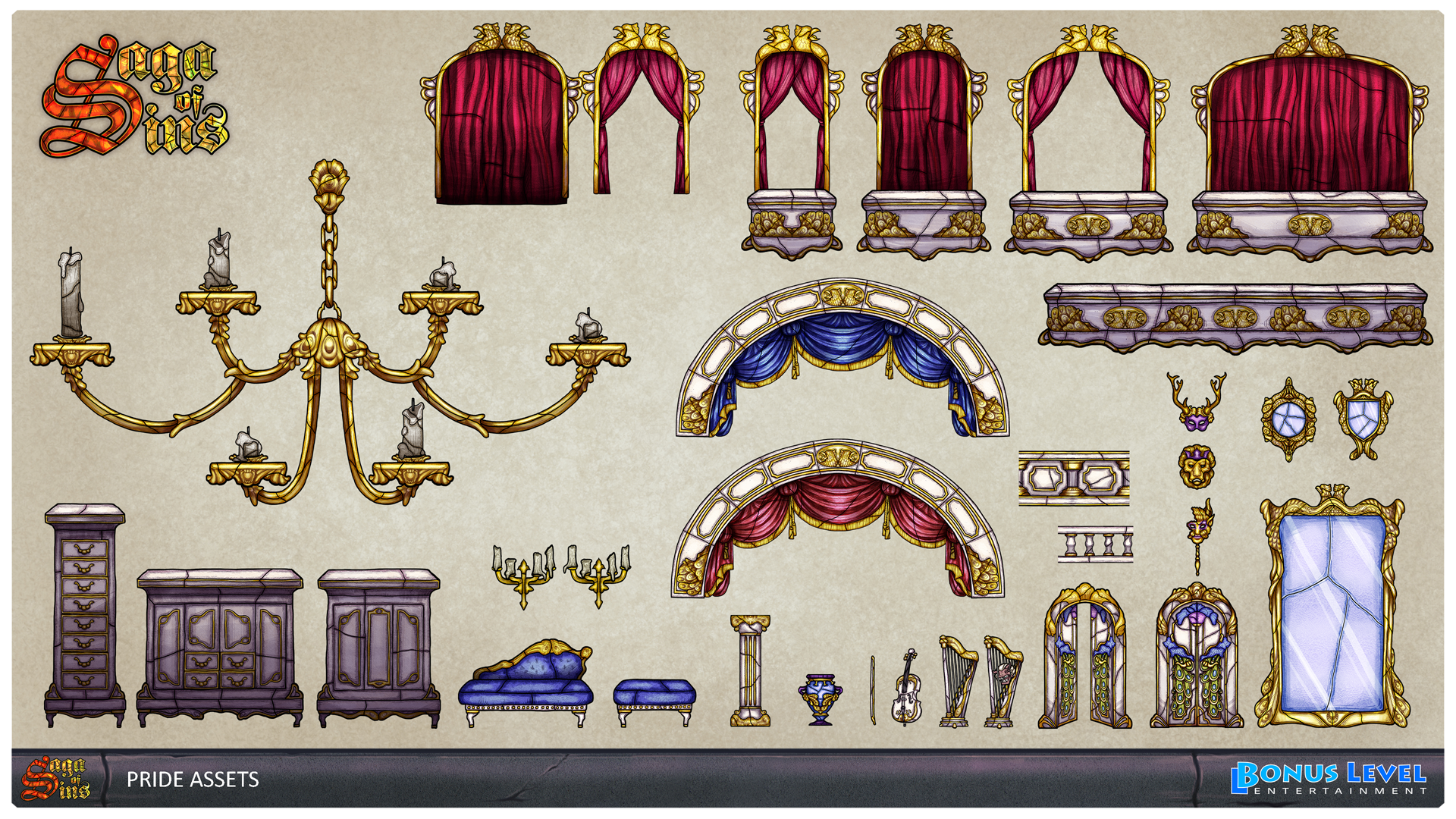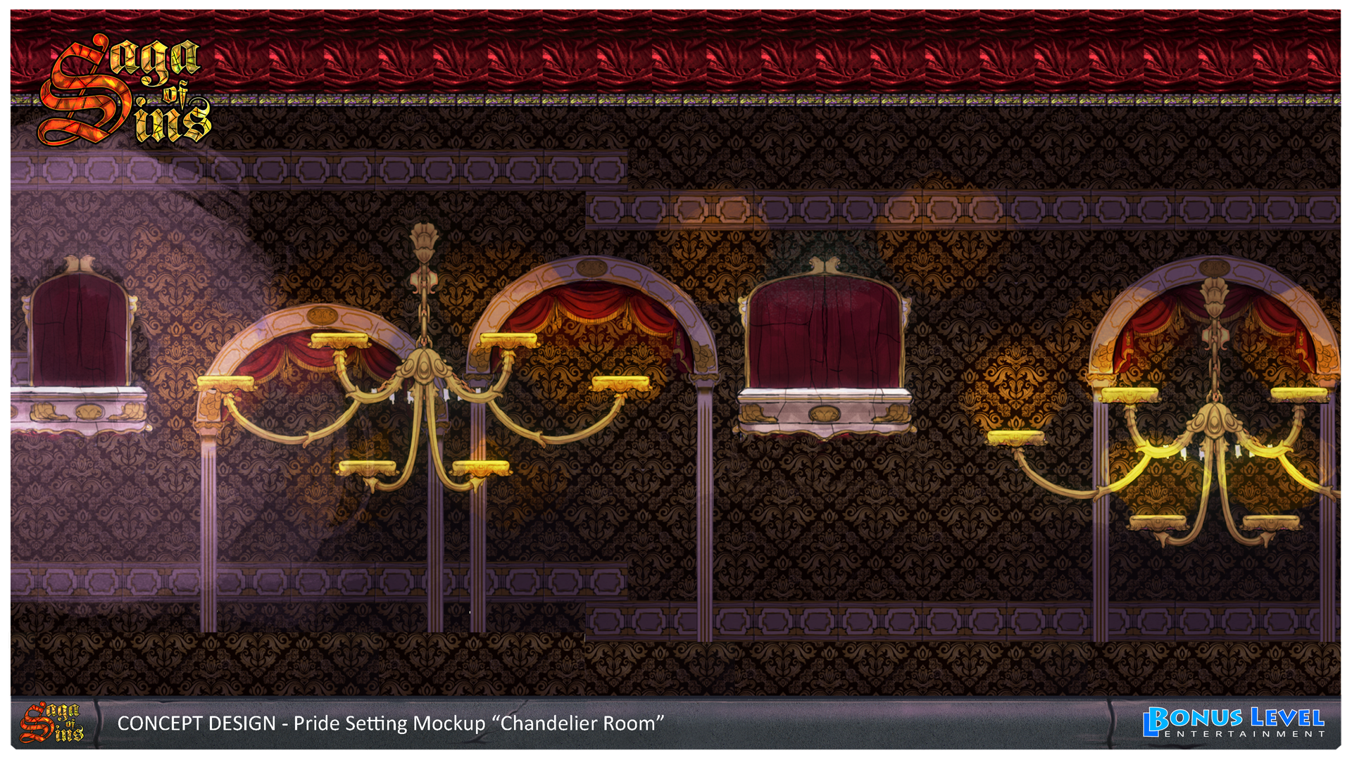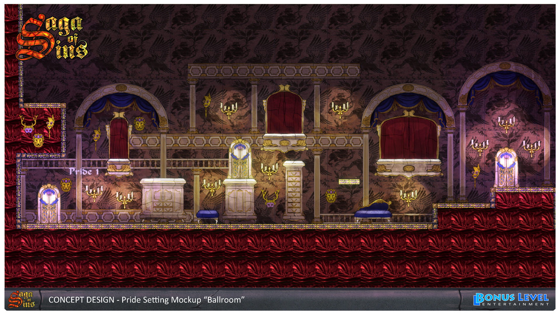 Even if it is historically not 100% correct - but hey, we are inside of people’s minds - the stage for Pride is an opera house gone ballistic, including a nice ¾ Waltz song to roll with. Mirrors and giant chandeliers play an important role in this one and a peacock is the signature enemy. And have you ever asked yourself, what lies behind the reflections you see in a mirror? Below are the concepts for the “Ballroom” and the bottomless “Chandelier Attic” two of the three sections we came up with for this deadly sin.
