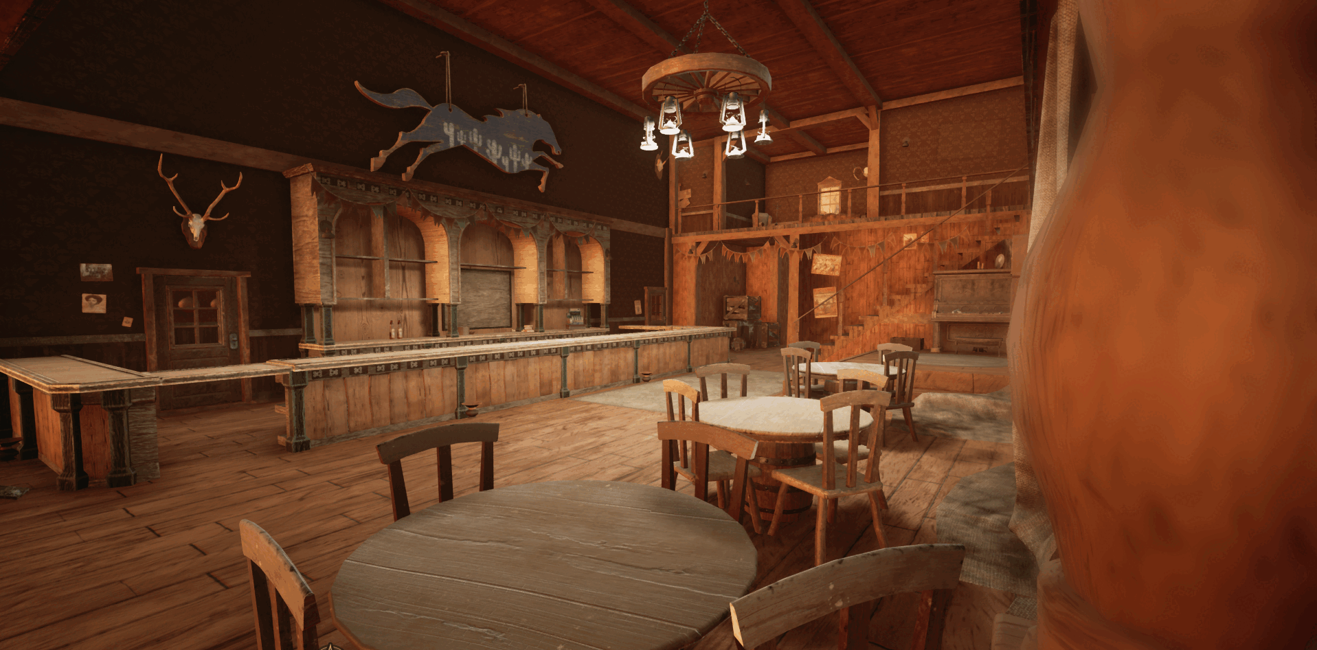 - [b]Improved woodwork and base furniture textures[/b] – We’ve refreshed not only the floors, but also wooden walls, beams, stairs, and exterior elements. Overall, the saloon’s woodwork has gone through a full visual overhaul to look more natural and detailed.