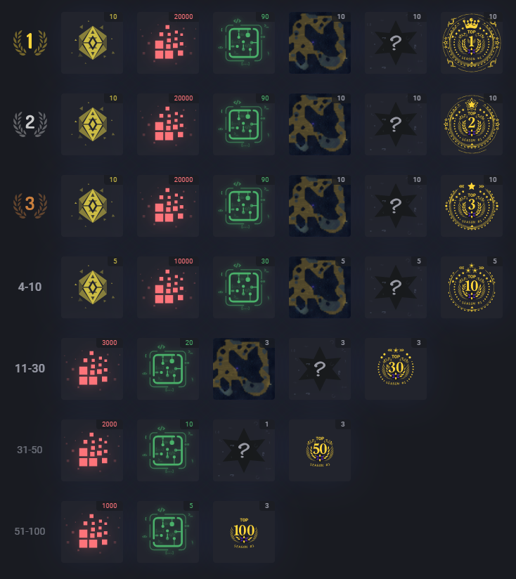 Every season will have different rules. Season #1 rules are described below: [quote]A new empty world is created. Every player has GCL/GPL 1 and 100 CPU from the start. New resource items appear in all rooms randomly from time to time. Collect and bring them to special structures placed in crossroad rooms to increase your season score. These structures are blocked by huge constructed walls on the season start, so you have to dig your way to them first. Players with the most collected resources win the season rewards. Other game changes: market is not available, terminal structures cannot be constructed.