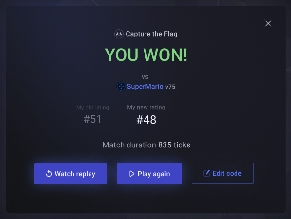 [b]The matching system finds an opponent based on versions of code.[/b] This may be not an easy idea to comprehend, but we think it is brilliant. When we are trying to find an opponent for you, we are looking not just at the opponent's rating. We are looking at his entire history of code versions to find a version that fits your rating in the best way. His latest bot is probably too strong for you, but a few days or weeks ago he had a much weaker code that may be a suitable match for your current code. In order to tune the system perfectly, we will even run "calibration fights" between old versions of all players in the background! This background activity will not affect your player rating (it is changed only when you run your latest code explicitly) but we keep track of hidden rating for old versions too to calibrate the system.