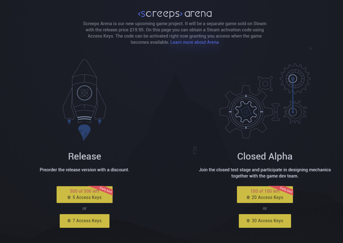 In this post we will describe Screeps Arena and its main design concepts. If you like it and feel that it is possible to you to help us fund this development, please buy some Access Keys and use [url=https://screeps.com/a/#!/arena][b]this page[/b][/url] (or the "Arena" menu inside the game) to preorder. You will gain a Steam activation key immediately and can activate it in your Steam client. The game will be downloaded to you as soon as it is ready.