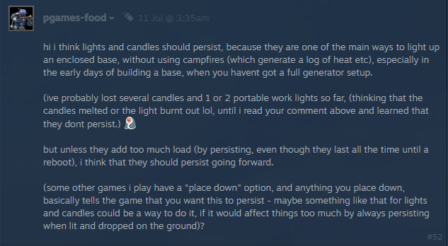 These candles, as most items with a few exceptions, were designed to not persist in the game due to server load issues. It is simply not possible to make specific exceptions for items like candles at this point. However, new lighting options are heavily requested in this community, we hear you on that part and we'll look further into possible avenues in the future.