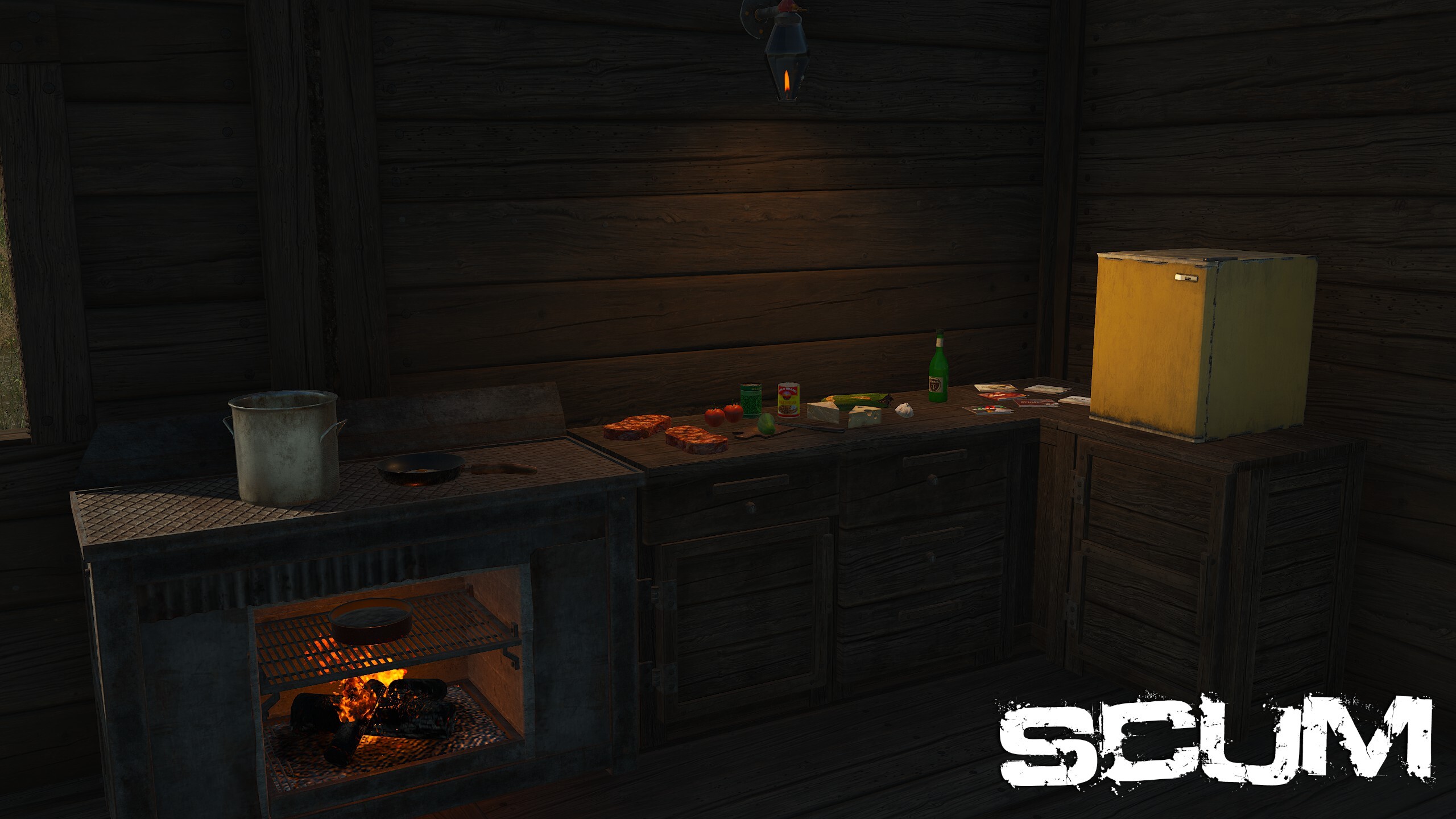 Here you can see new stuff added, such as [b]new improvised oven[/b], it has 2 cooking slots above and 1 baking slot below. Some nice [b]new kitchen elements and counters[/b], each one with its own storage space to keep your kitchen area nice and tidy. And yes, what you see on the wall there, [b]a gas lamp[/b]. A new (and not the only) light source for your bases, finally giving you more options to give more light.