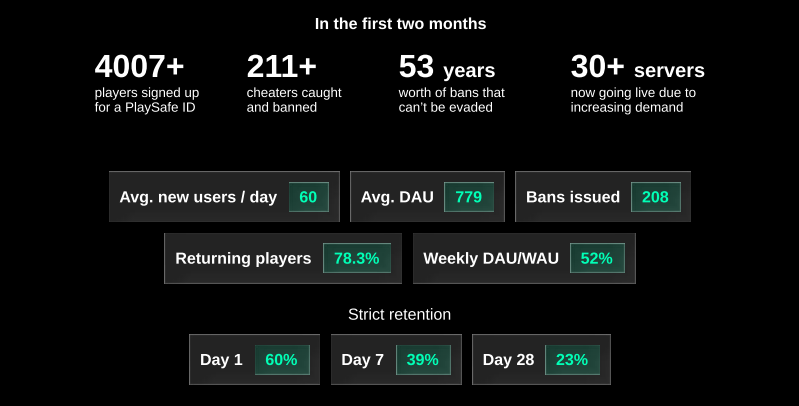 We've been quite pleased with the response that we've received, and we've seen a steady increase of interest for PlaySafe ID signups as players report significantly fewer issues with cheaters on servers. We're happy to see this collaboration going forward and because of this, we've decided to expand the number of servers that utilize PlaySafe ID which you can see in the list below:
