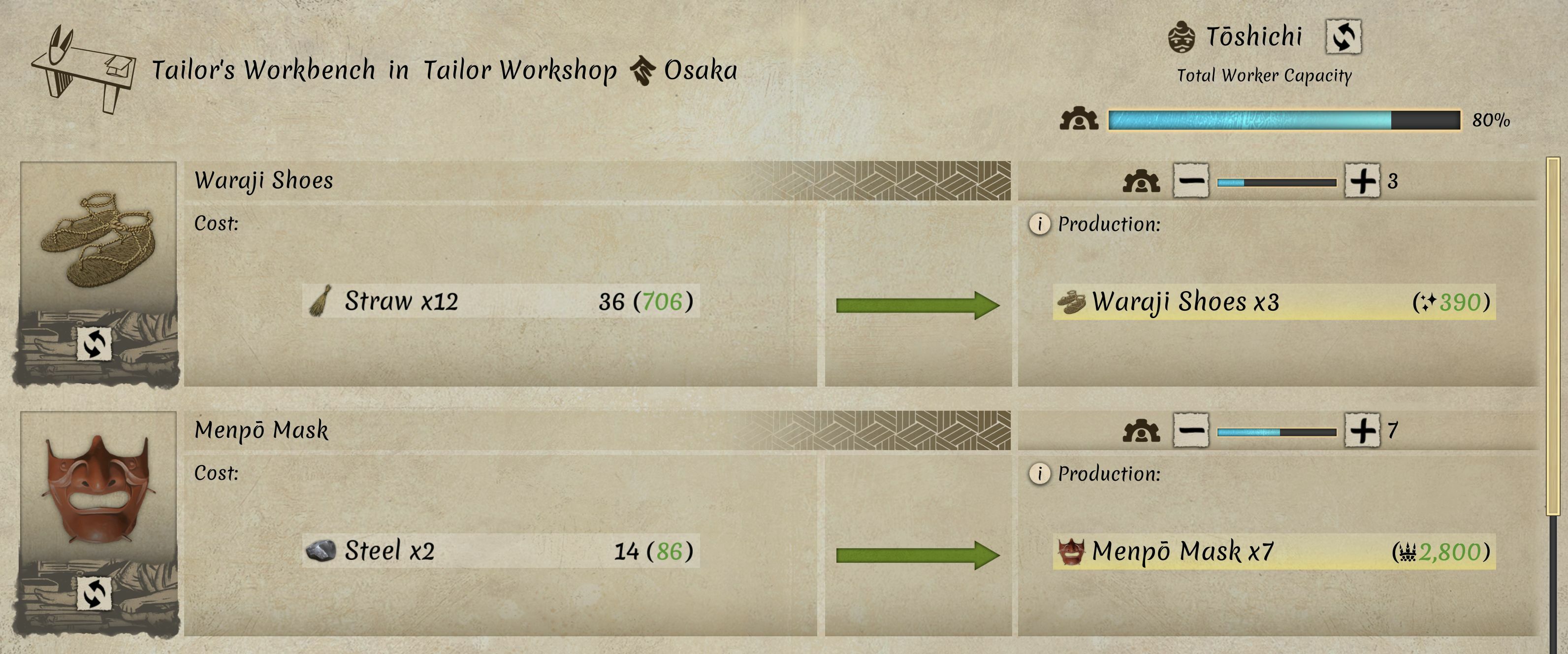 Managing your villagers' work will now be much easier! Redesigned workplaces will offer better visual clarity, while improved notifications and warnings will better inform you of any production issues. Here are some specifics: Each worker has a work capacity pool that you can allocate to any number of recipes being produced at a given workplace. Previously, the system was limited to 4 production slots. Now, one worker will be able to handle any number of unique recipes at low efficiency or just one at full efficiency — the choice is yours! You are now able to assign production tasks to a worker at any time, even if you don't have the necessary resources or tools. Your workers will produce as much as they can for the day and then wait for more resources. Missing resources and tools will be automatically gathered by workers to achieve the production level you assigned. For example, after adding the missing item to the dynasty's storage, your worker will automatically take it and produce the assigned recipe by the end of their workday. The effectiveness of tools was reworked to make production even more efficient and to make it easier for you to meet your villagers' needs. Better tools will allow you to get more products from the same number of resources and work. The production results section now shows exactly what a given recipe produces and how many of your villagers' needs it will satisfy. The recipe cost section now displays information about the required season or access to resource sources. The tool and production results sections now display useful tooltips, for example, listing all tools compatible with a given recipe. You are now able to manually remove recipes, workers, or tools from the workplace if you want to halt or modify some chains of production.