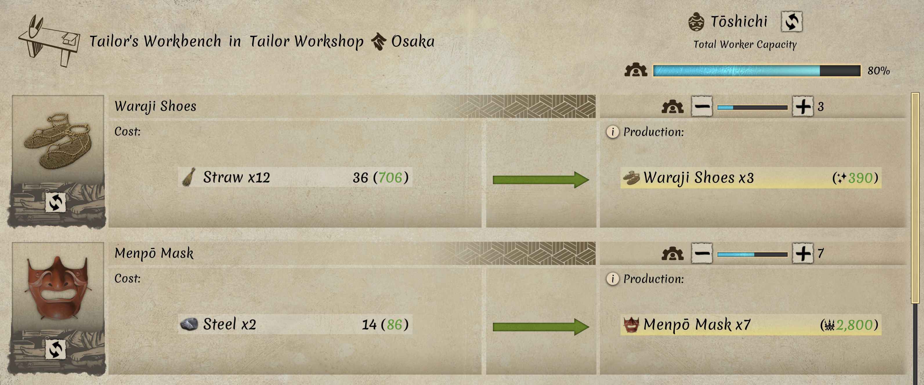 [*] Missing resources and tools will be automatically gathered by workers to achieve the production level you assigned. For example, after adding the missing item to the dynasty's storage, your worker will automatically take them and produce the assigned recipe by the end of their workday.