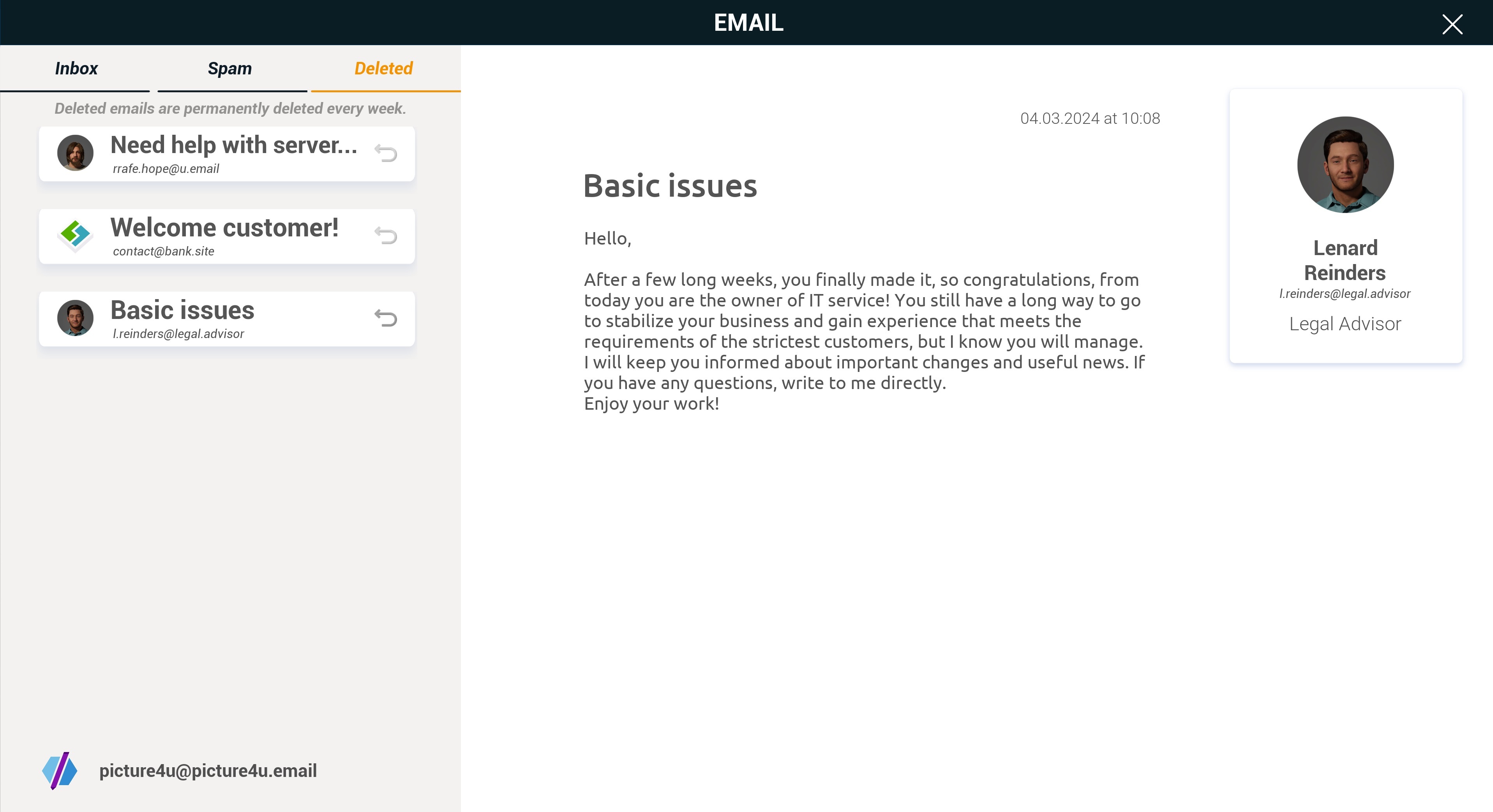 - added “trash” tab in the email and the ability to restore deleted emails (emails from the trash are deleted at the start of a new week)