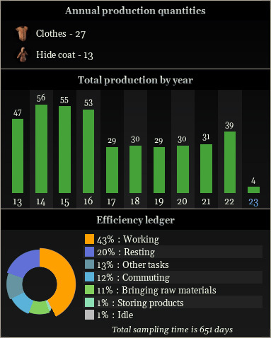 Every 5 seconds (1 game day), the tasks performed by workers are recorded. These records are kept for up to 1 game year, allowing players to see the average task distribution of workers in production buildings via the production records section. Hovering over any worker in the worker list shows the task distribution for that worker only. This tool helps players see how much time workers spend working, commuting, and transporting or storing resources, allowing for better planning.