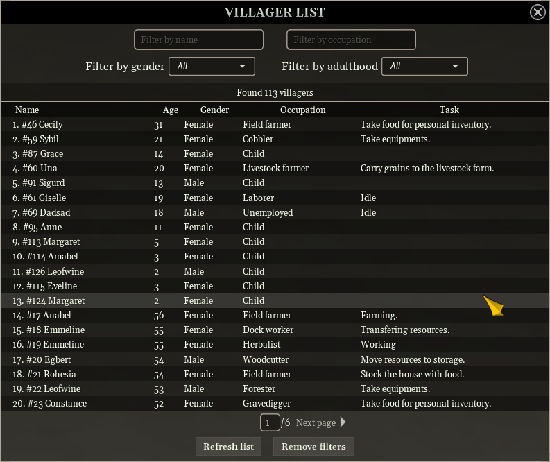 An interface listing all living villagers has been added to the game. In this interface, players can search for villagers by name, profession, gender, and age. The interface provides information on the name, gender, age, profession, and current task of each villager. Clicking on any villager in the list takes the player to that villager.