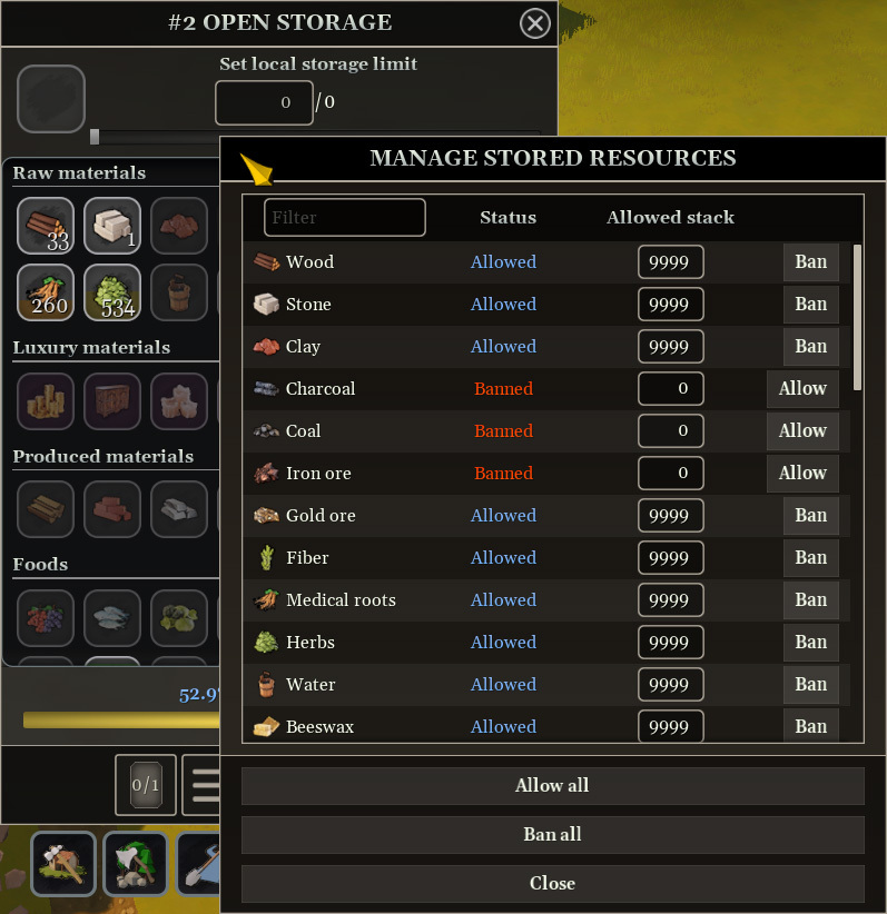A new tool has been added to designate which products will be stored in storages. In the interface of storage buildings, you can open the manage stored resources panel in the management section to collectively ban, allow, or set the desired stock amount for products.