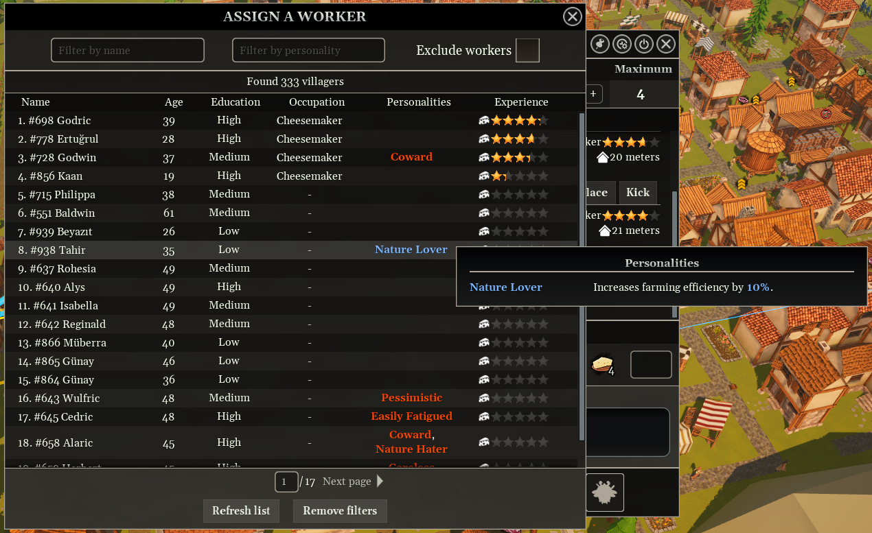 - [b] Assigning and reassigning workers: [/b]With the addition of villager traits, you may want to assign certain villagers to work in specific buildings based on their traits. Worker assignment and replacement buttons have now been added to the building interfaces. With these buttons, you can search for idle or working villagers by name or trait and assign them to the relevant building.