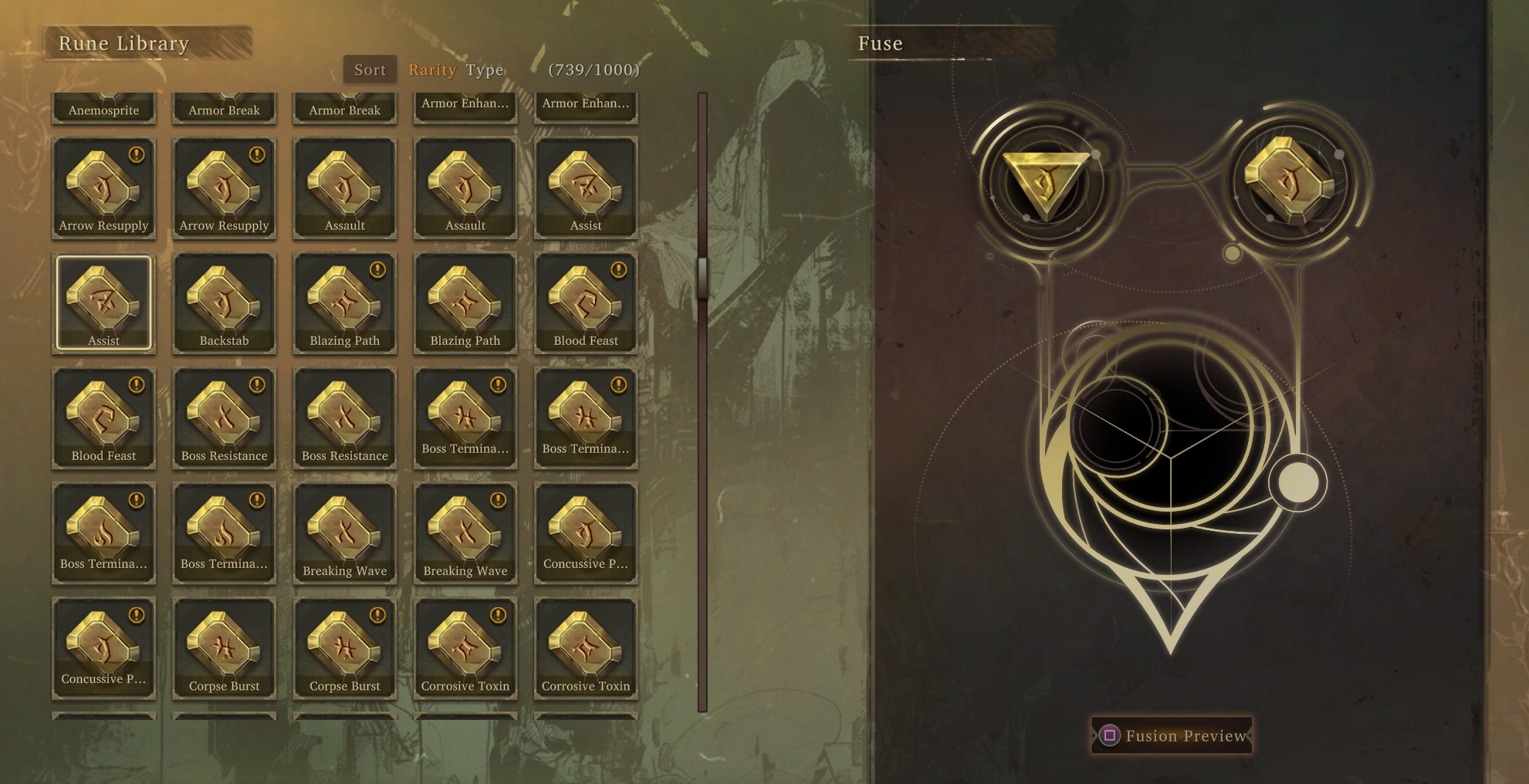 You can then select two runes of gold quality or higher to preview the fusion: