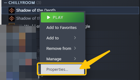 1. Go to your Steam Library and find Shadow of the Depth. Right-click on it and select "Properties..." from the menu as shown below: