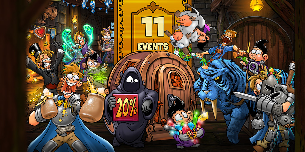 Now get ready for the following [b]OKTOBERFEST EVENTS[/b] from Friday to Sunday: Legendary Dungeon, Crazy Mushroom Harvest, One Beer, Two Beers, Free Beer, Glorious Gold Galore, Witches' Dance, Fantastic Fortress Festivity, Assembly of Awesome Animals, Forge Frenzy Festival, Days of Doomed Souls & Tidy Toilet Time.
