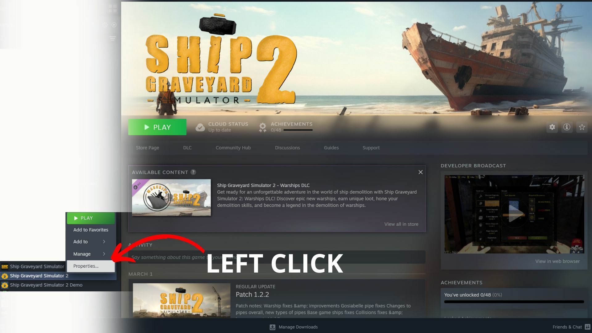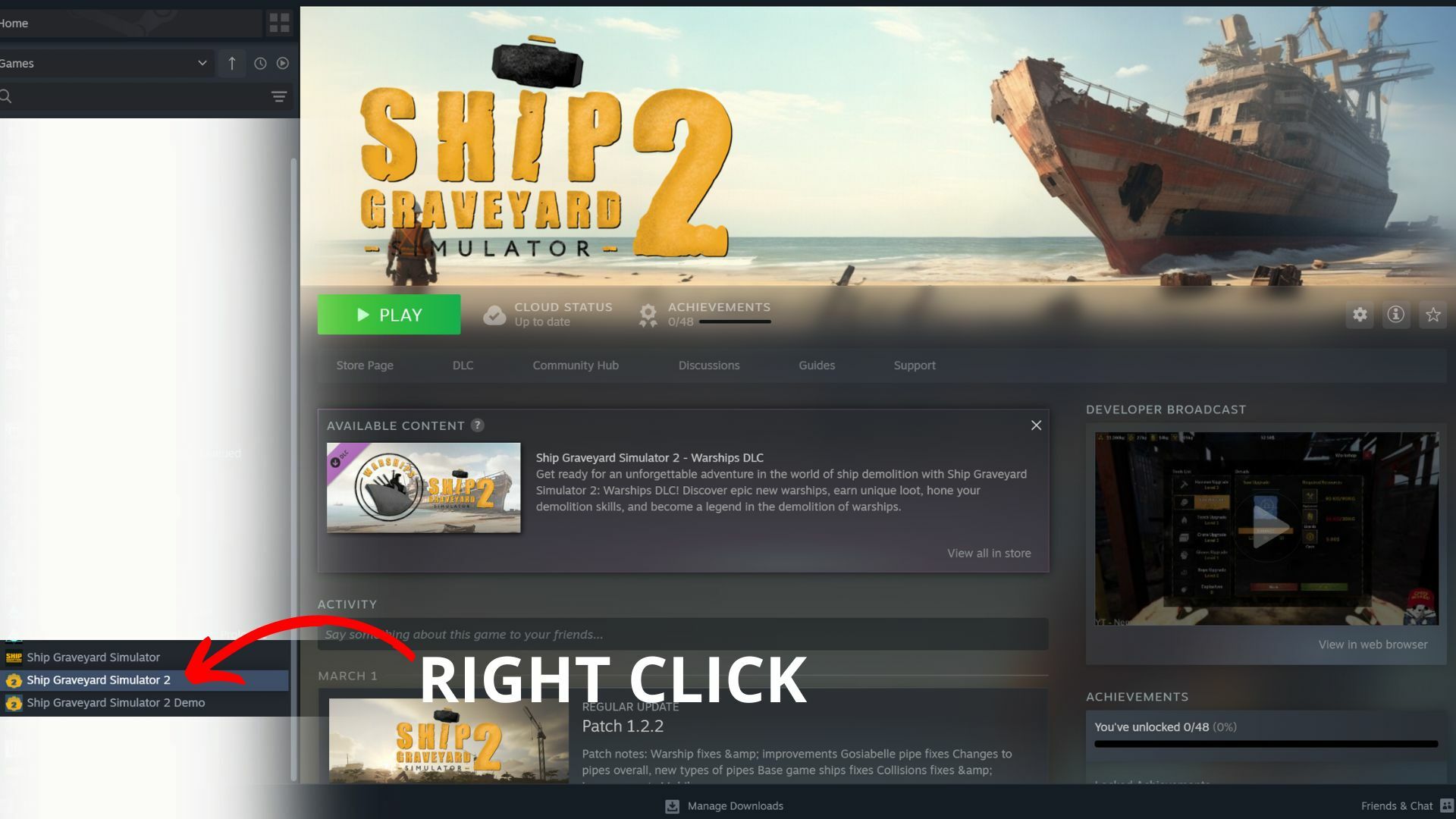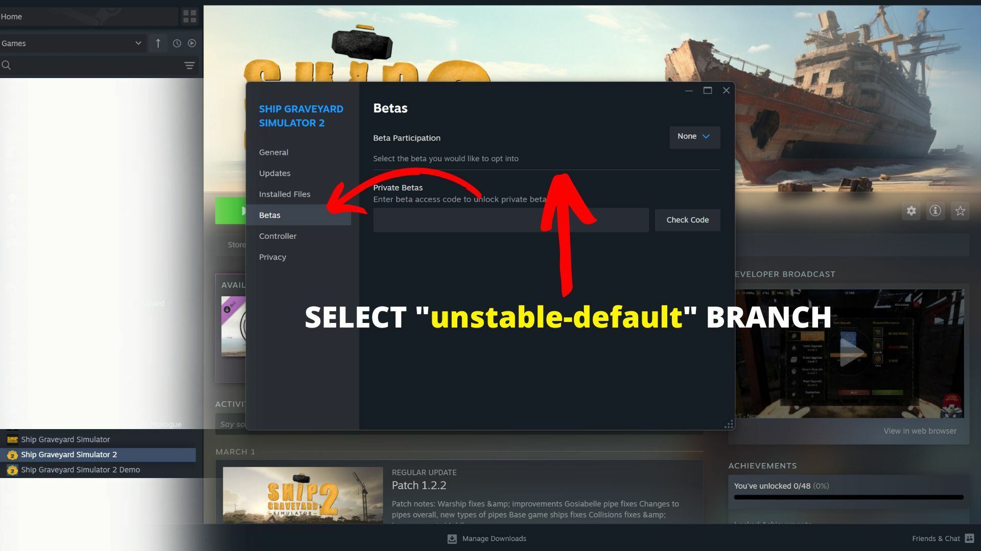 1️⃣ Make sure you own Ship Graveyard Simulator 2 in your Steam library. 2️⃣ Find the game in your library and right-click on it. 3️⃣ Select Properties. 4️⃣ Open the Betas tab. 5️⃣ Select the “unstable-default” version from the dropdown menu. 6️⃣ Enter the password: ShipTest1235
