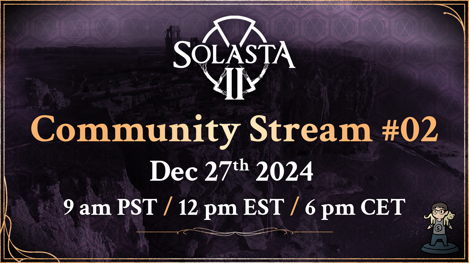 For those of you who are still around, join me for a cozy [url=https://link.solasta2.com/sn_Twitch]Community Stream[/url] on Friday 27th - where I will be sharing development anecdotes and answer more questions from viewers. Grab a cup of hot cocoa, wrap yourself in a blanket and let’s have a little chat! [url=https://link.solasta2.com/sn_Twitch]