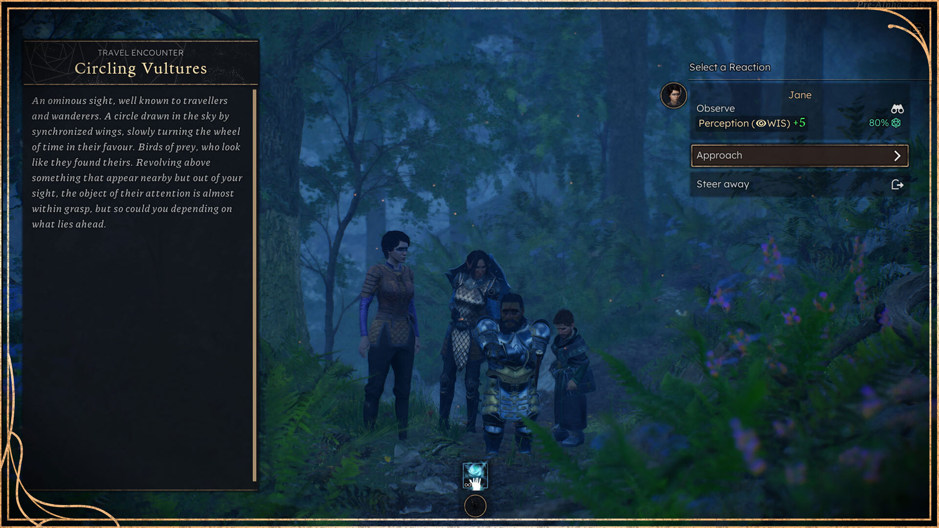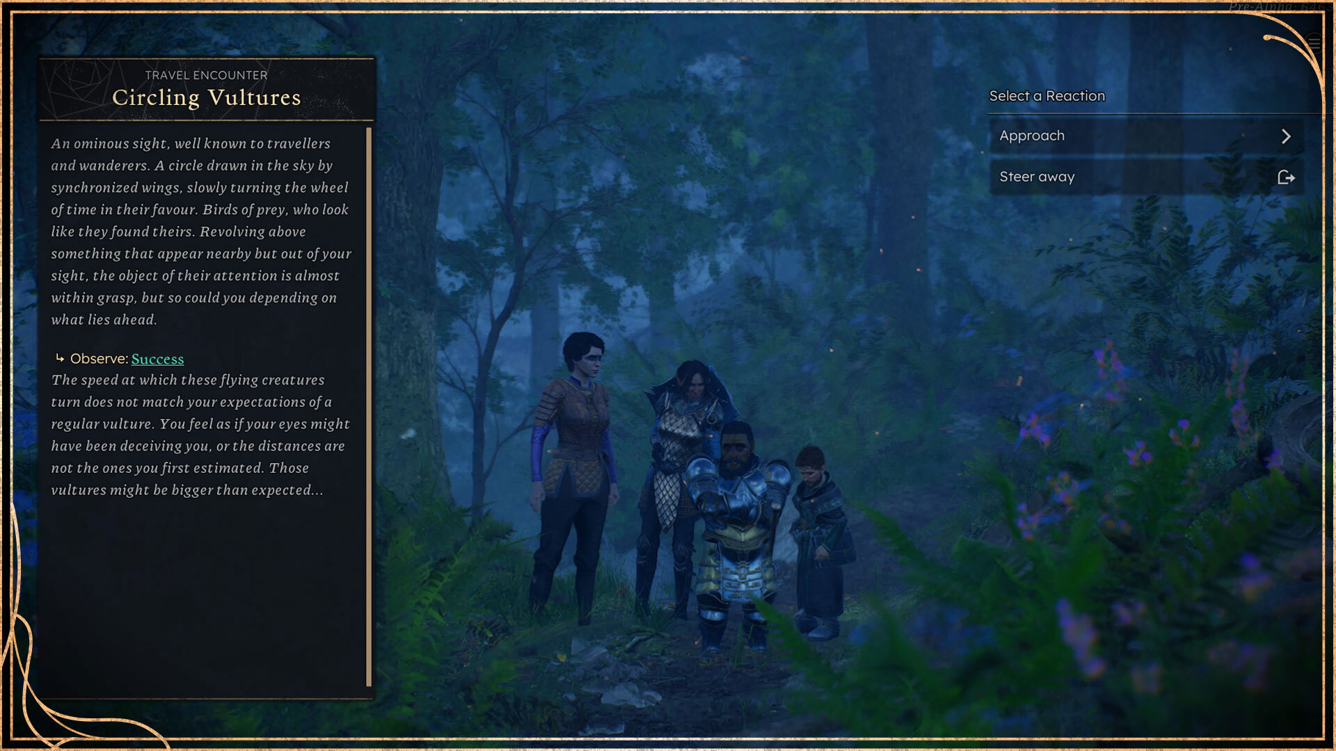 In this example, you can see that during Forced March (since we’re at night), our party has spotted a kettle of vultures circling the skies. You have several different options to choose from, some of which may result in combat!