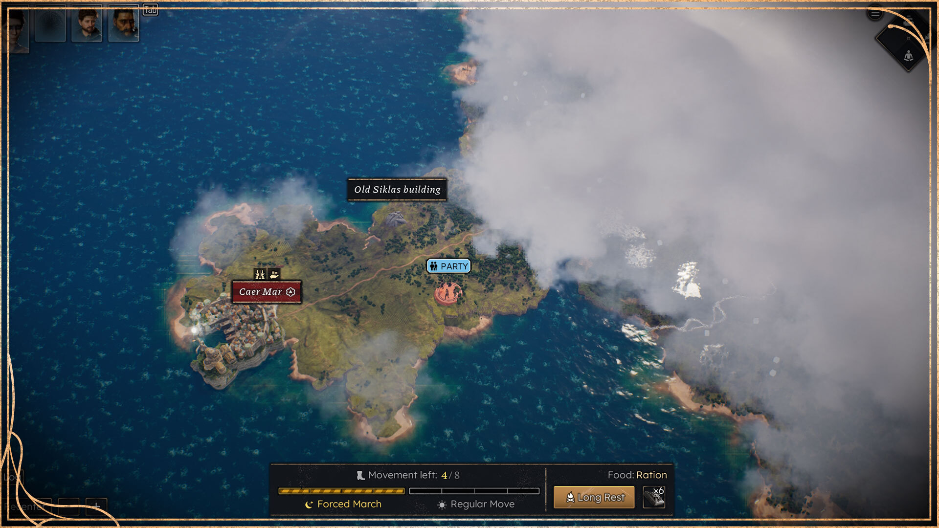 That’s also why you’re seeing a Movement bar on the bottom of the screen - with [b]4 Regular Move points[/b], and [b]4 Forced March points[/b]. Depending on the terrain you’re crossing, you will burn a different amount of movement points - forcing you to take more time when not sticking to the roads between major settlements.