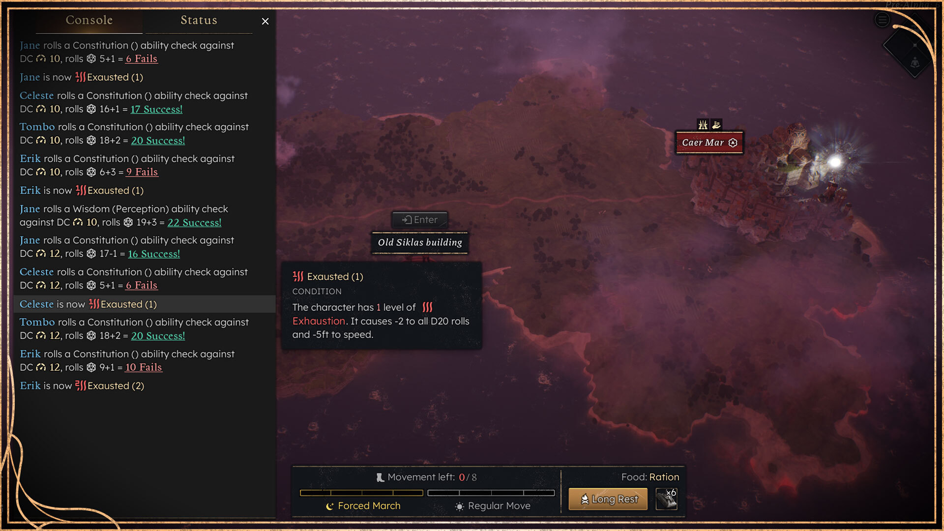 As you can see here, after moving through two different tiles under Forced March, some of my party members gained a level of exhaustion, decreasing the result of all their D20 rolls by 2. One even gained two levels, meaning they’re getting a -4 penalty! If that wasn’t enough, they also move slower in combat by 5 feet per level of exhaustion.