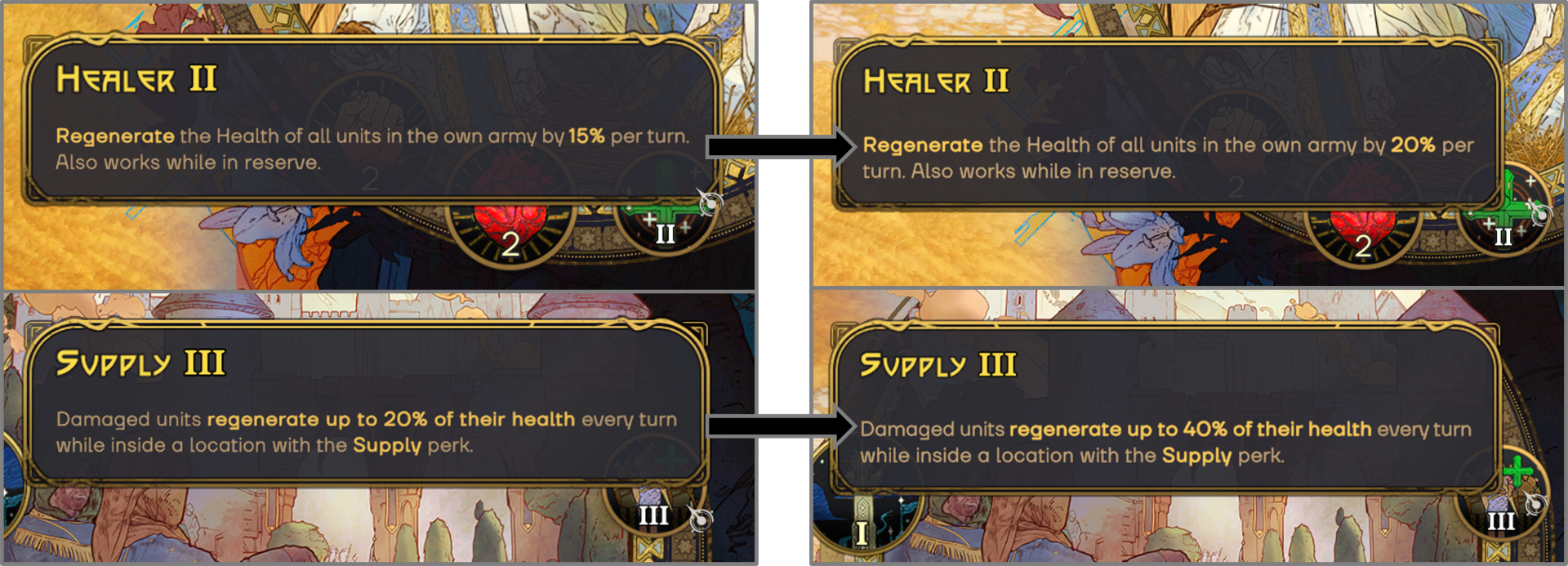 - ????⚕️ [b]Healing increased[/b] from Healer perk (units) - [strike]8%>15%>20%[/strike] / 10%>20%>30%