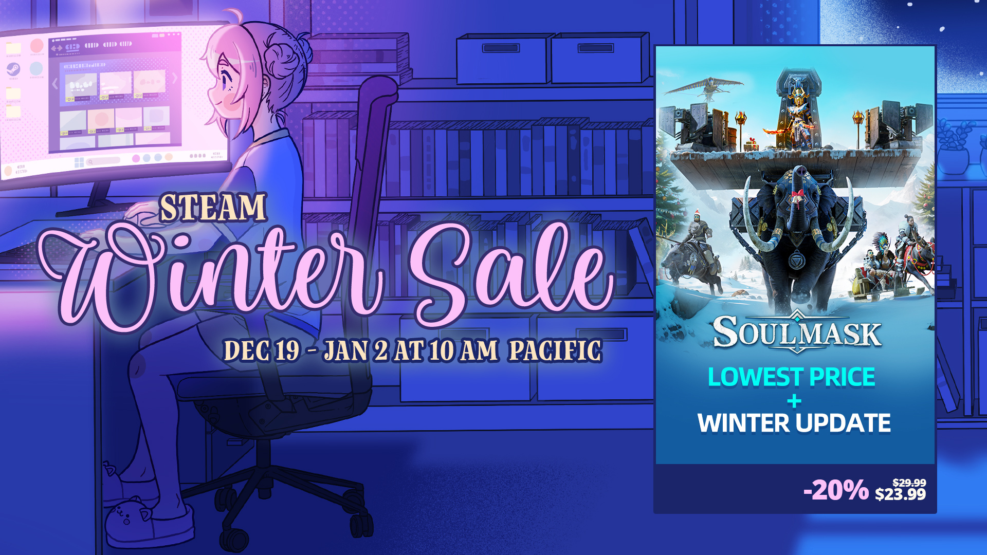 We hope all Chiefs are immersed in the holiday spirit and enjoying your time in Soulmask! We've also recently been running a 20% off sale during the Steam Winter Sale (December 20th - January 2nd)! [b]This will be our lowest price of the year! [/b]If you're not already a part of Soulmask, don't miss out on this!