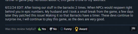 Especially those Chieftains who spent enormous effort giving us lengthy positive reviews, like [b]@VeronaKate, @Heitri,[/b] and [b]@Bleddy[/b] (by the way, Bleddy, tribesman tools are more intelligent now! You should come back and try it). I have a particularly strong impression of [b]@~MysticalKitty~'[/b]s supplementary comment. She and her husband were troubled by enemies constantly spawning around barbarian camps. After we fixed it, her additional praise made our development team incredibly energized: such recognition of our modification work gave meaning to our nightly hard work.