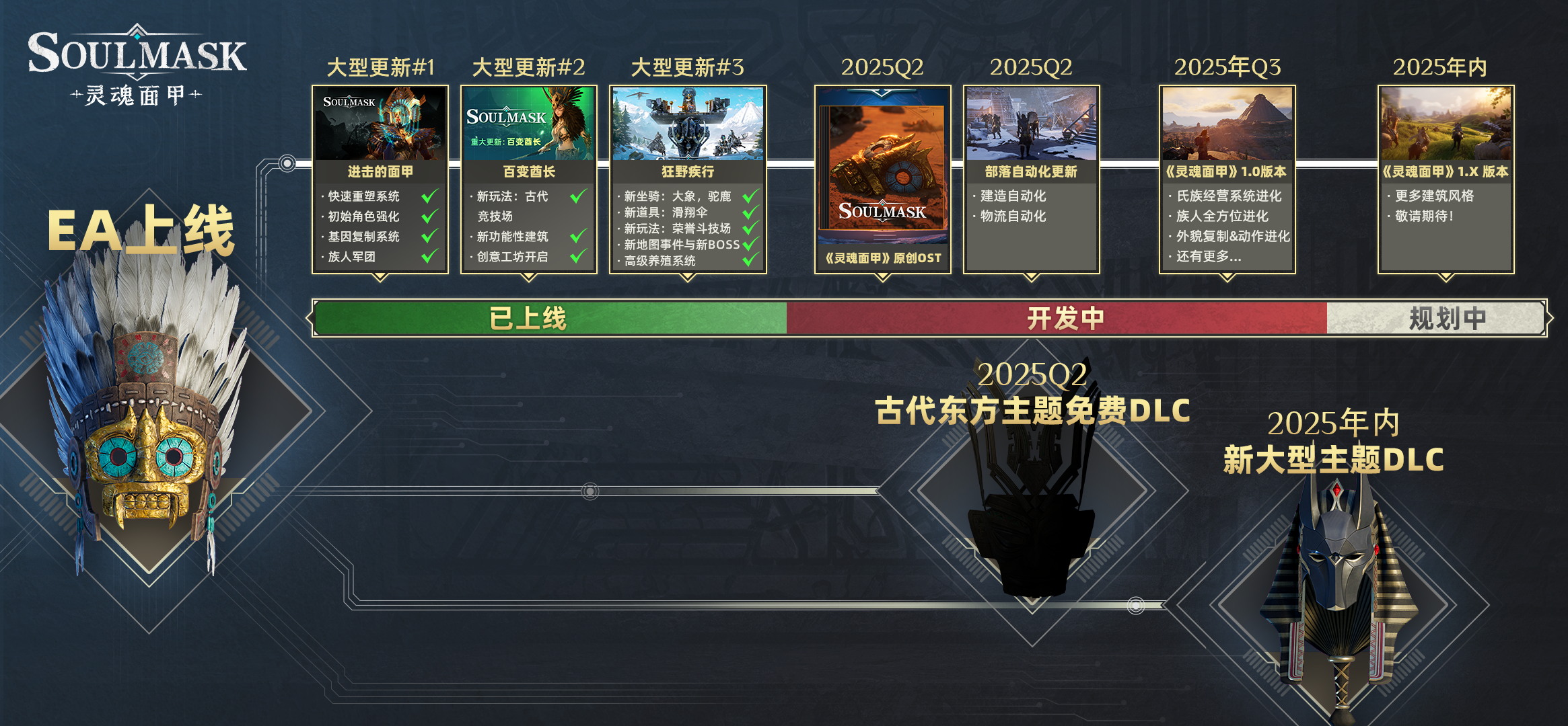 [url=https://steamcommunity.com/games/2646460/announcements/detail/4191240933898343704][b]In the letter[/b][/url] I sent at the beginning of Early Access I mentioned the concept Soulmask yearns to explore with players: the mysterious mask capable of "consciousness uploading" as a possibility for civilization development: