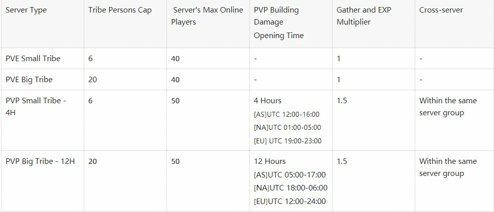In light of users' demands, we'll optimize the official server categorization based on the former test. In Persons, we'll divide it into Big Tribe Server and Small Tribe Server, and both servers have the PVP/PVE mode. In PVP Opening Hours, PVP Building Damage Opening Time for Big Tribe Server is 12 hours, while that for Small Tribe Server is 4 hours. We believe it's more wholesome in this way. The Gather and EXP Multipliers are also different in different game modes. The details are as follows: