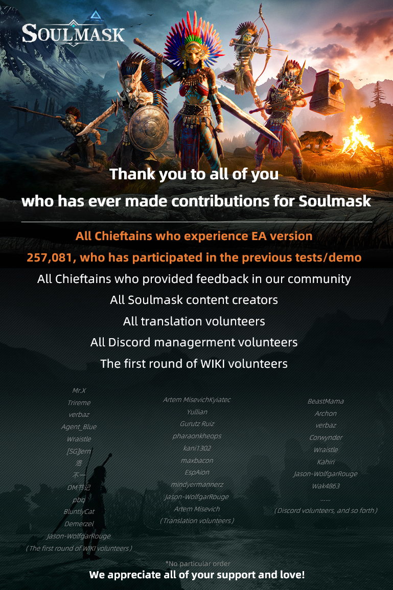 Last but not least, I want to say thank you to all of you who has ever made contributions for Soulmask:—— Thank you——