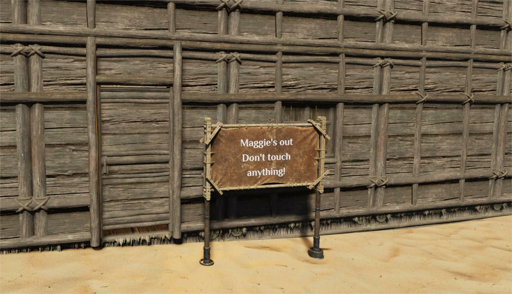 It is well known that tribesmen can not read, except for the Chieftains who wear masks. But that doesn't stop Maggie from using bulletin board to warn those dishonest companions.